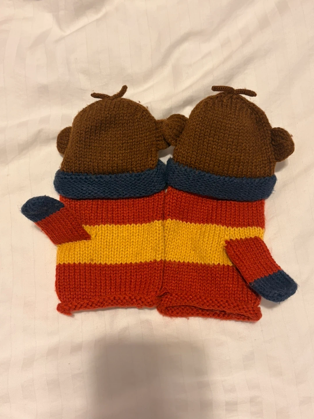 Keep your little one's hands warm with these adorable monkey mittens! These mittens feature a cute monkey face design with a playful, colourful striped pattern that's sure to bring a smile to any kid's face. They are in good condition, ready for new adventures and cozy cuddles during chilly days.