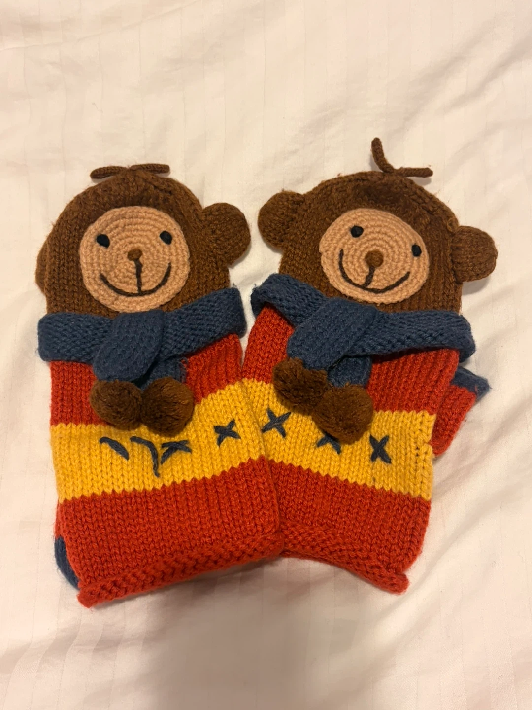 Keep your little one's hands warm with these adorable monkey mittens! These mittens feature a cute monkey face design with a playful, colourful striped pattern that's sure to bring a smile to any kid's face. They are in good condition, ready for new adventures and cozy cuddles during chilly days.