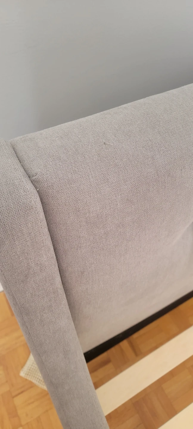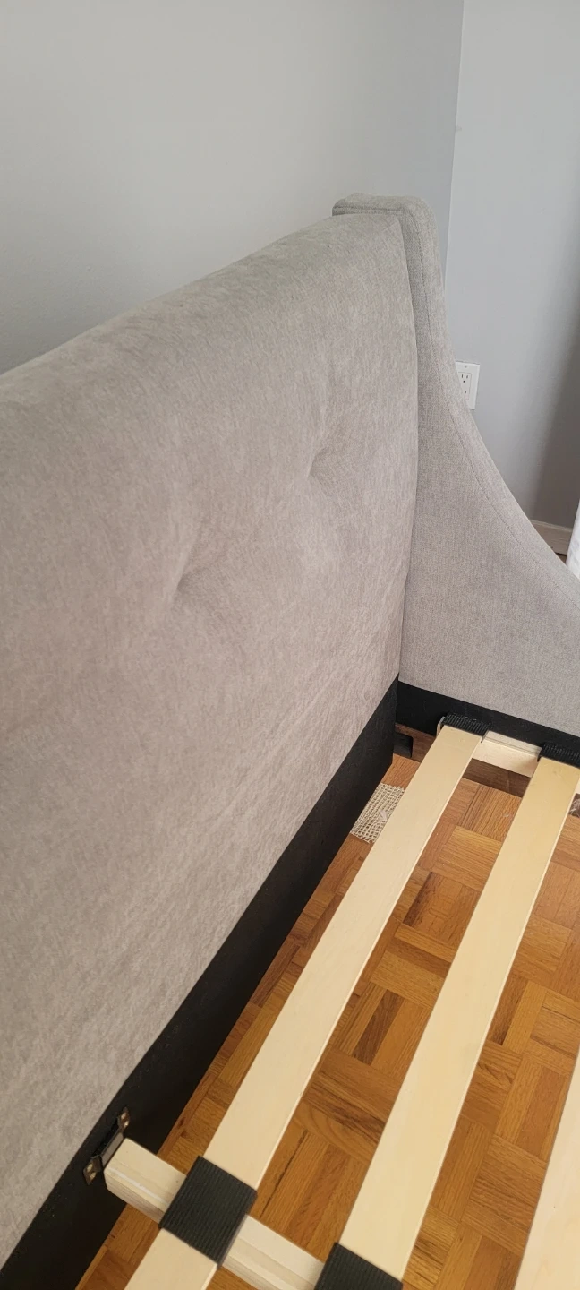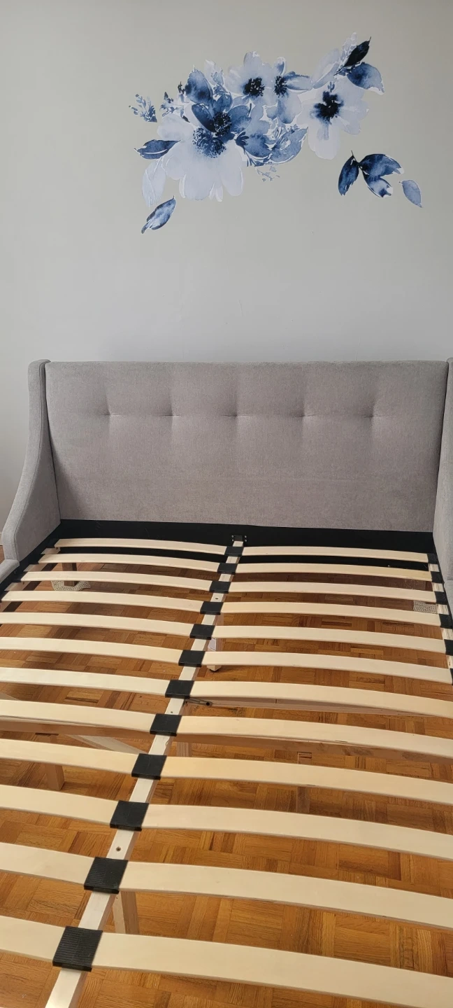 This upholstered bed frame comes with a stylish grey fabric and a tufted headboard. It includes wooden slats for mattress support. It's a queen-sized bed frame.