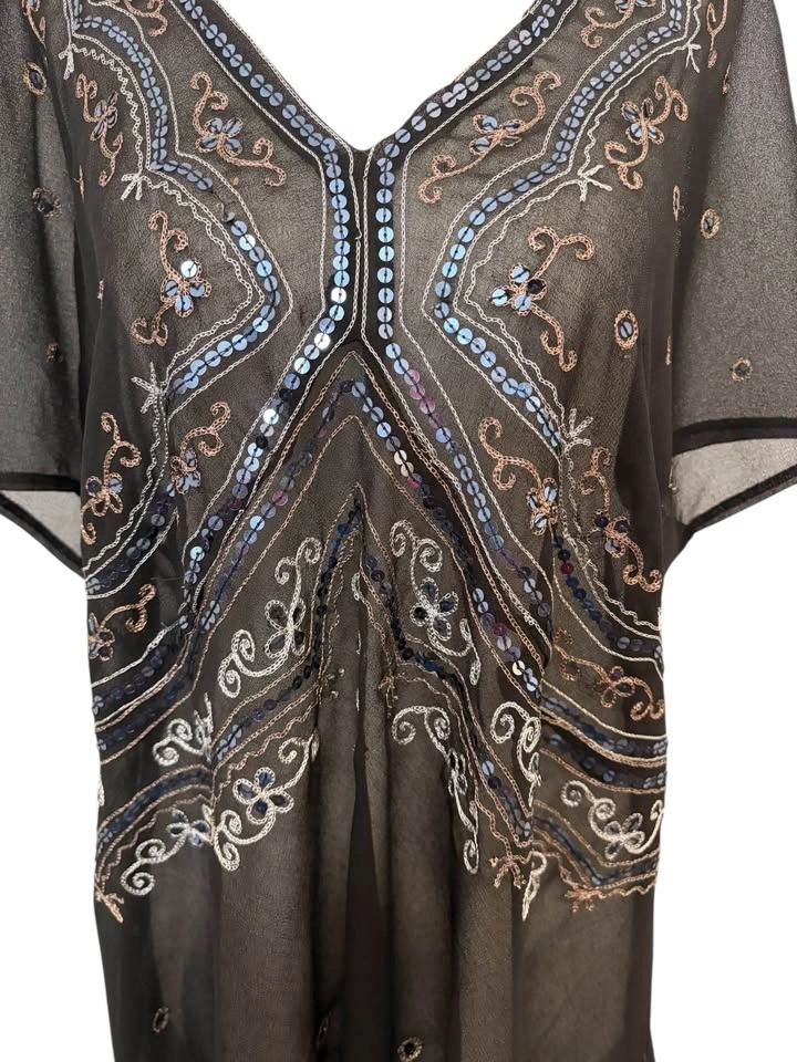 Black embellished kaftan tunic with sheer fabric and intricate beadwork and sequins. Relaxed fit and airy design make it perfect for layering.