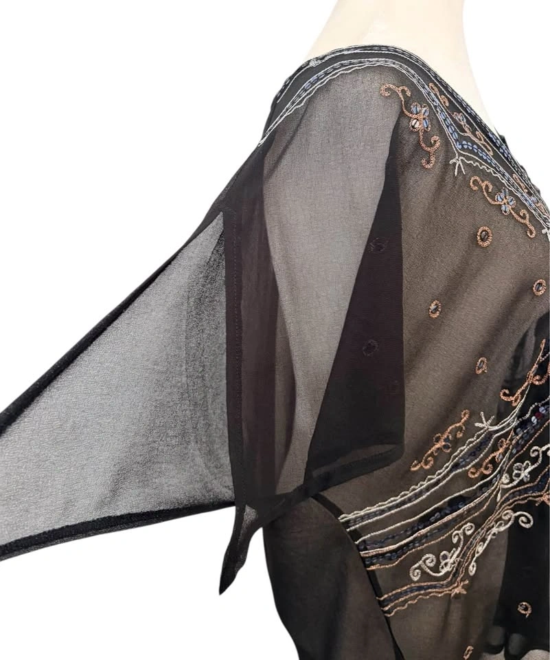 Black embellished kaftan tunic with sheer fabric and intricate beadwork and sequins. Relaxed fit and airy design make it perfect for layering.