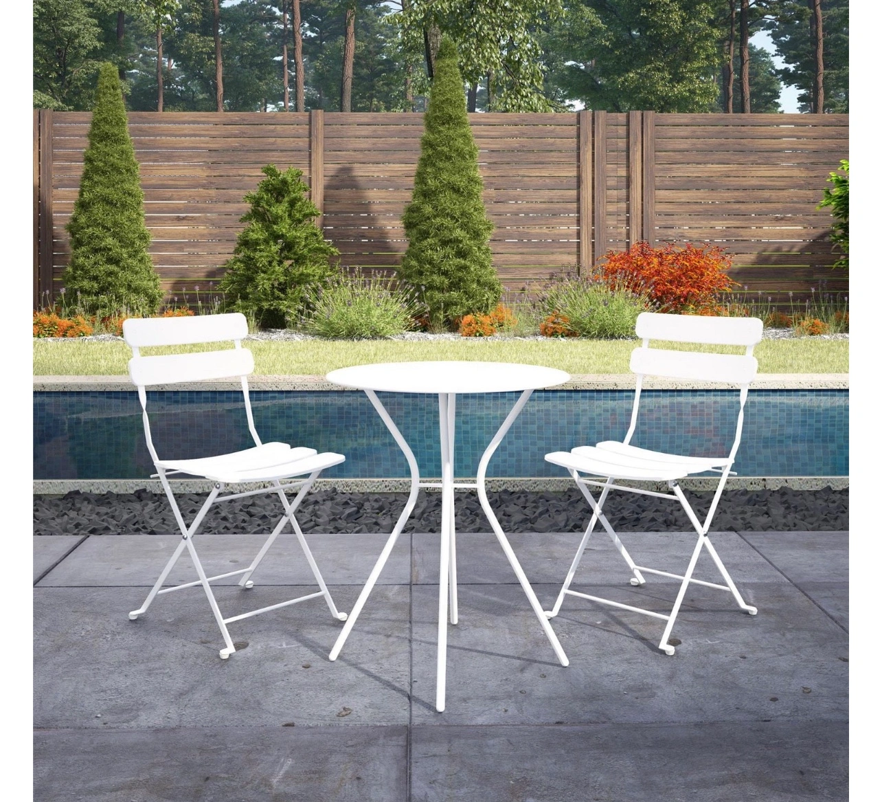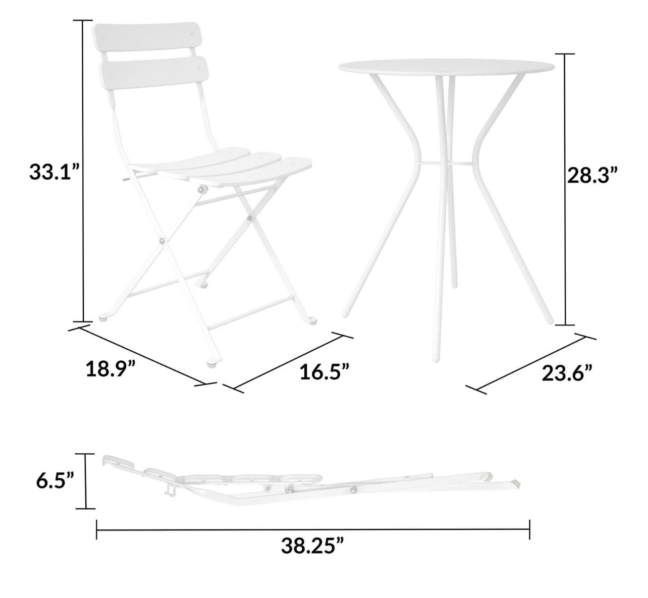 Designed with weather resistant, powder coated steel • Chair have compact fold of 16.5” W x 6.5” D x 38.25” H for easy storage in your garage or closet when not in use • Chair have compact fold of 16.5” W x 6.5” D x 38.25” H for easy storage in your garage or closet when not in use • Chairs open dimension: 16.5” W x 18.9” D x 33.1” H. Table dimension: 23.6” diameter x 28.4 ” H. Weight Capacity of 250 lbs. per chair, 100 lbs. for table • Chairs ship fully assembled. Simple table assembly. All hardware and tool included