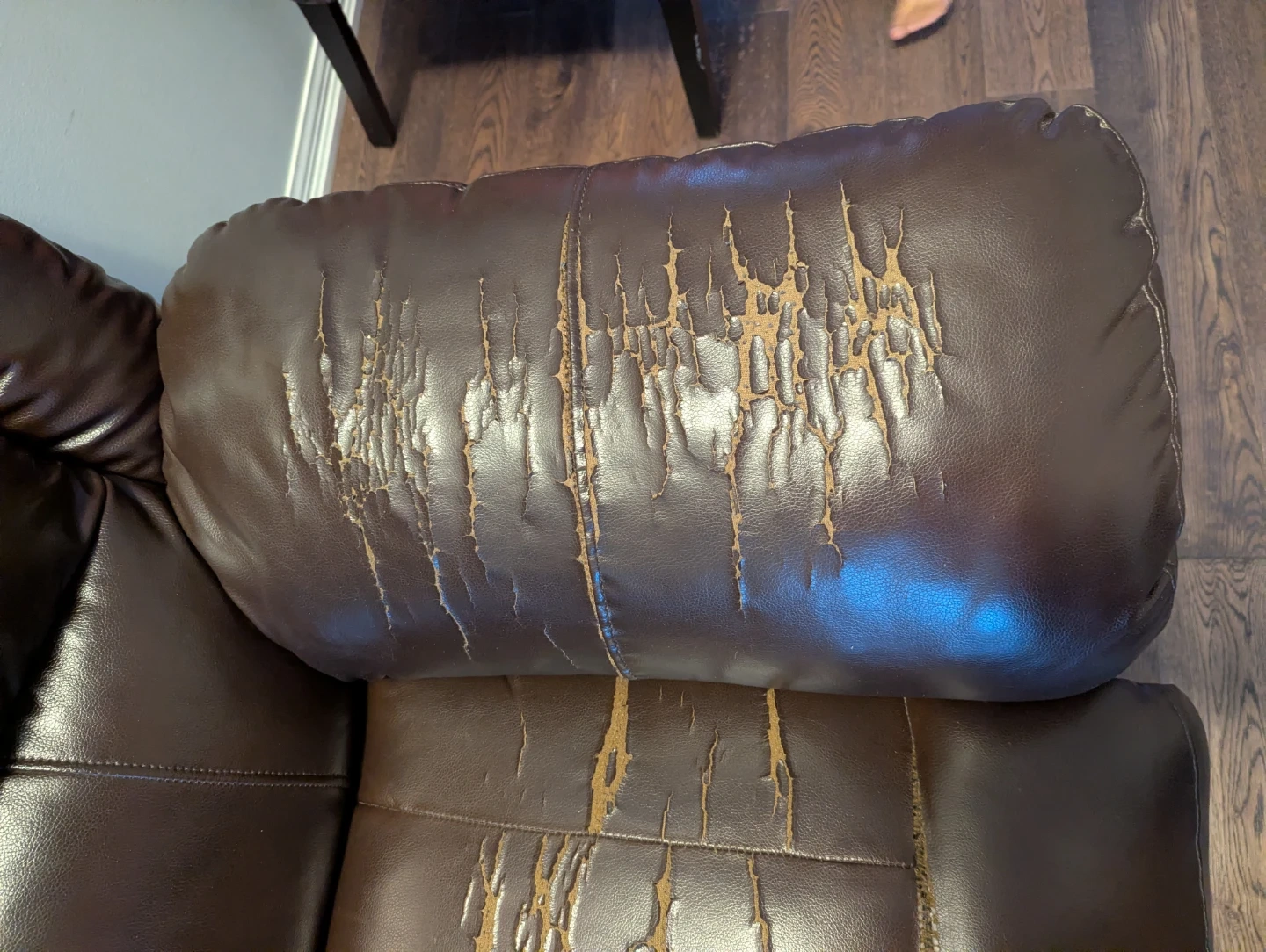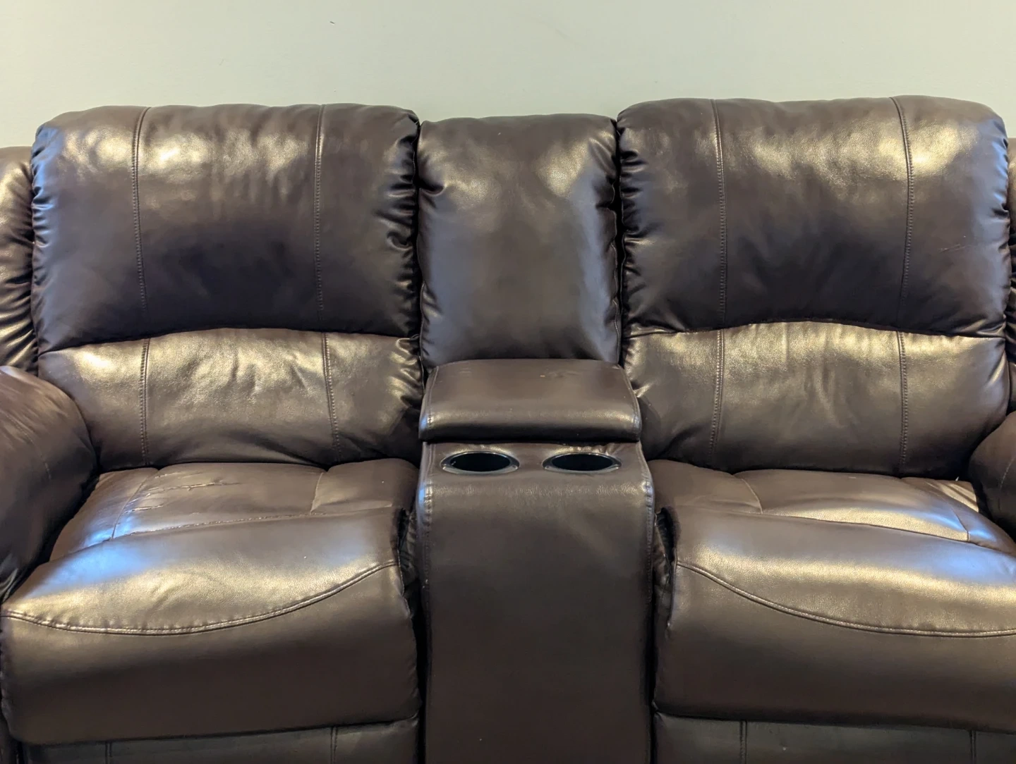 Brown reclining sofa with faux leather upholstery and a centre console featuring two cupholders. It's a three-seater with reclining seats. Some wear and tear on the seat cushions and top of the backrest. This sofa would be useful for a basement family room or a starter home.