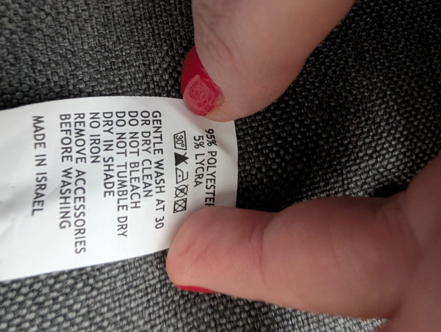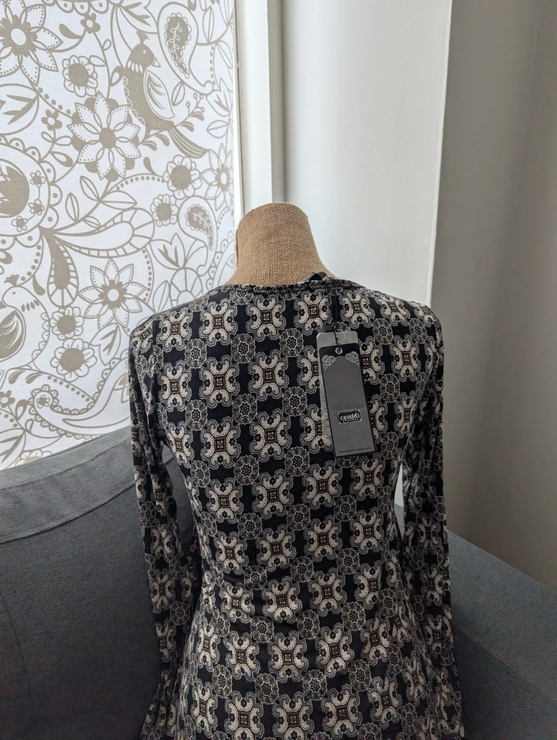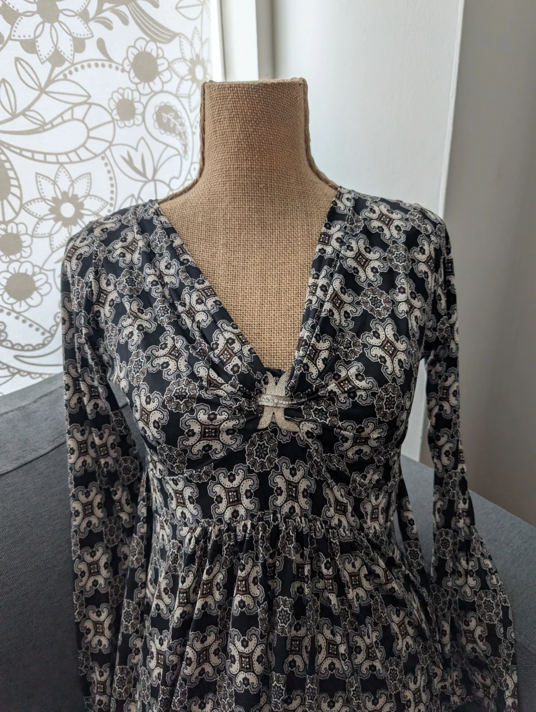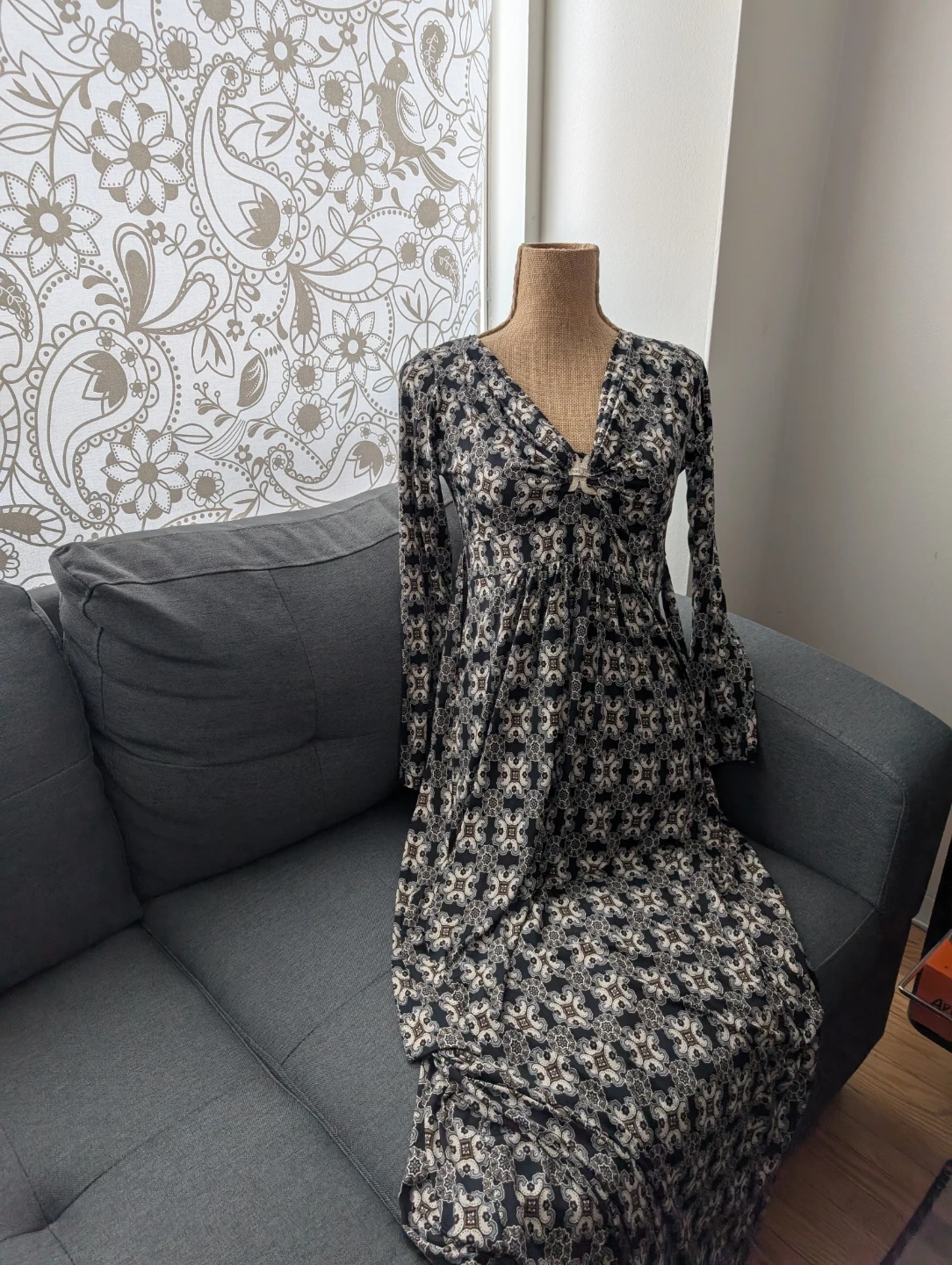 Cassidi Boutique long sleeve maxi dress with a dark floral pattern. Made with 95% polyester and 5% lycra. Garment care instructions include gentle wash at 30 degrees. Made in Israel.