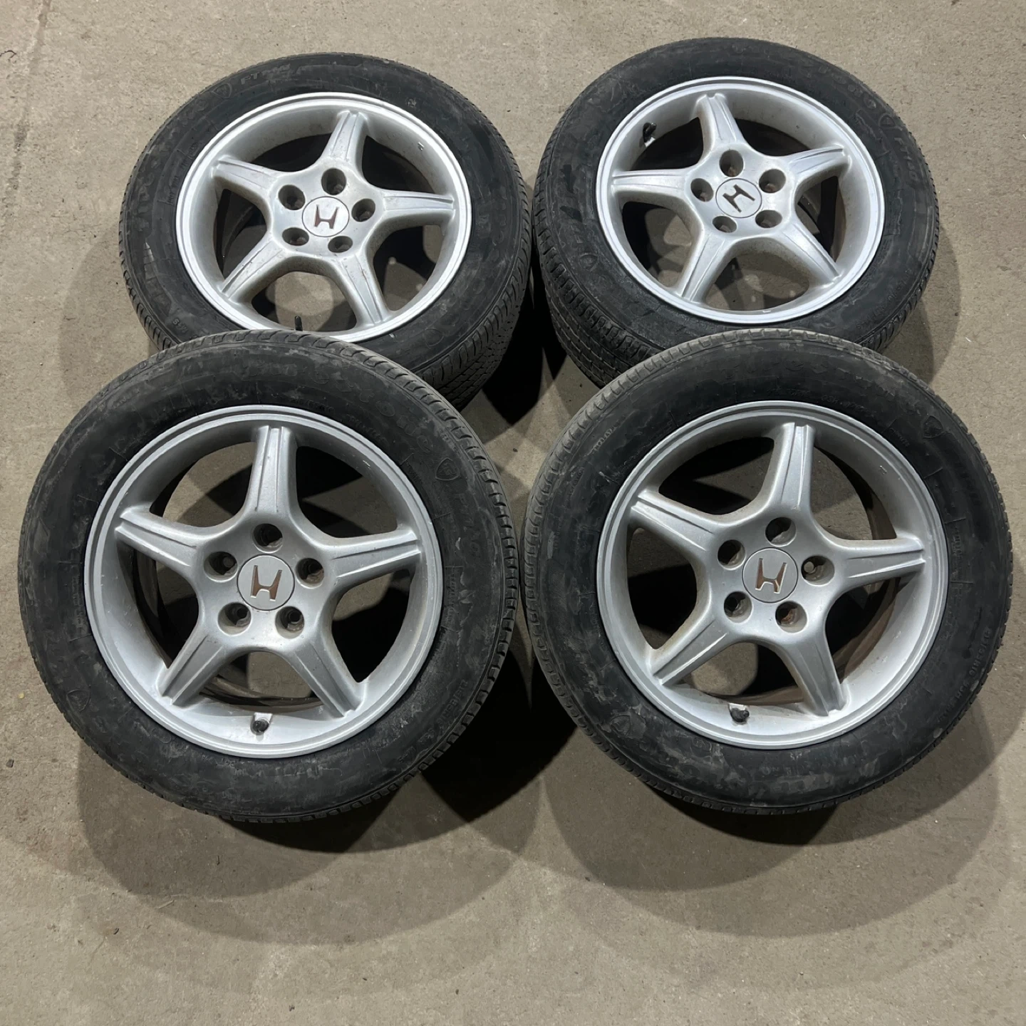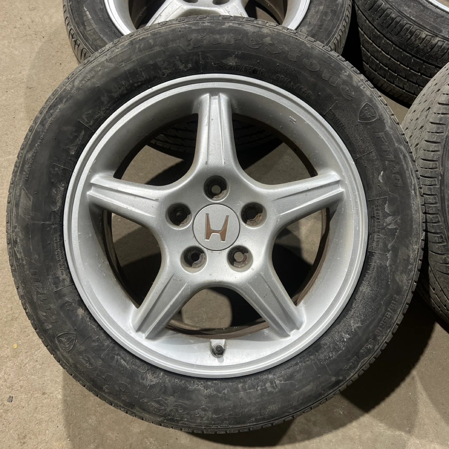 Set of four 215/55/16 all season tires mounted and balanced on OEM Honda aluminum alloy wheels 5x114.3 64.1 for Honda Civic. Tires have about 50% tread, enough for one season.