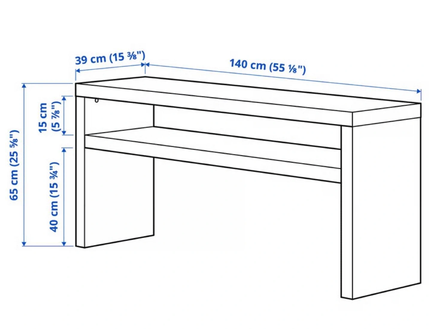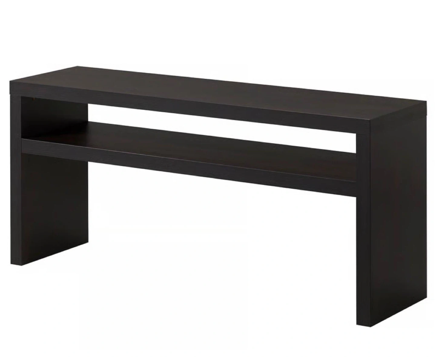 This IKEA bench offers a sleek, modern design in a dark brown finish. It's 140 cm (55 1/8") wide, 39 cm (15 3/8") deep, and 65 cm (25 5/8") tall. Features a convenient open shelf space below the top surface. Its simple structure makes it suitable for entryways or as a console table.