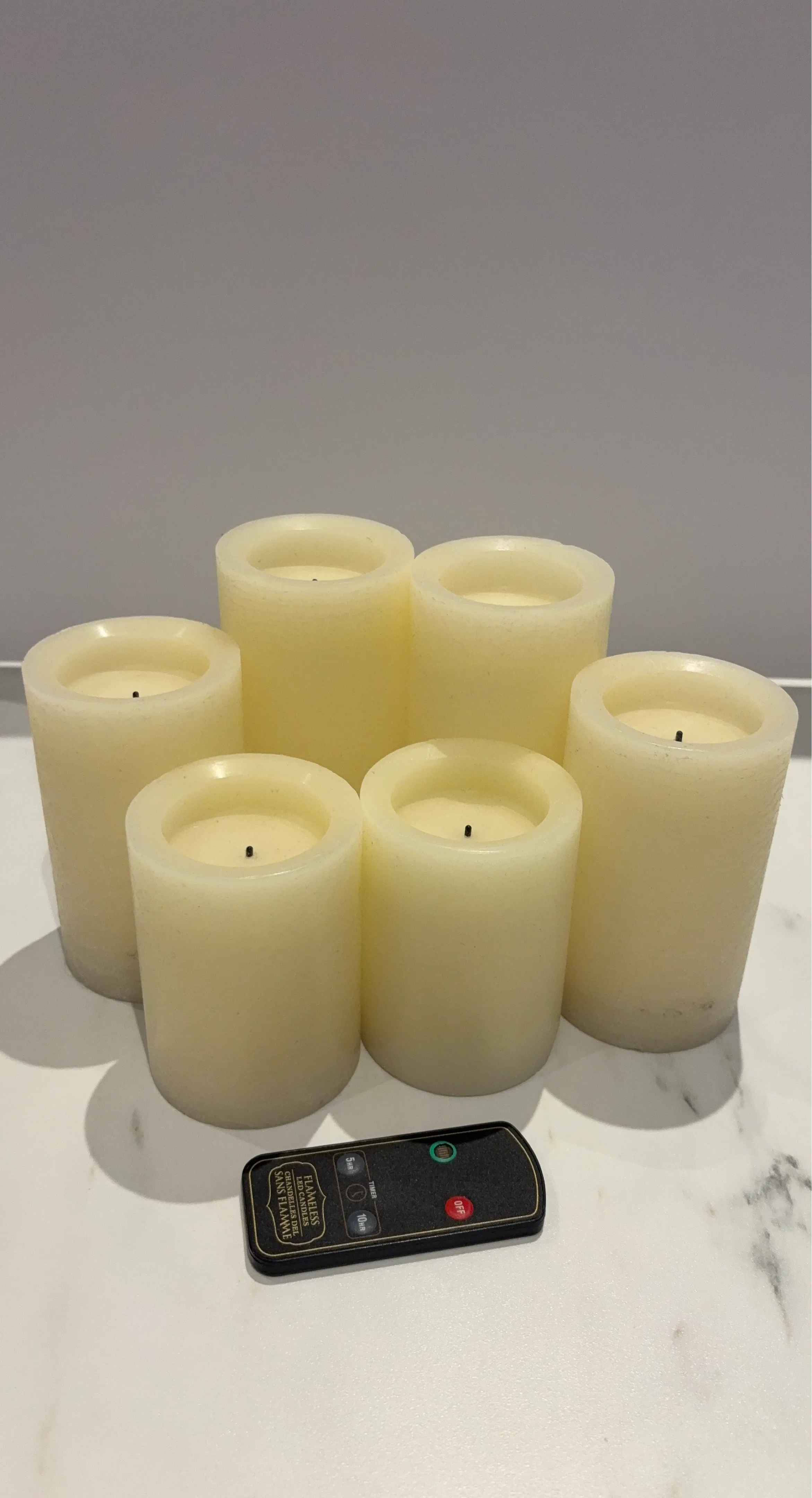 These flameless LED candles come in a set of six. They include a remote for easy operation. The candles have a realistic wax feel and flickering effect.