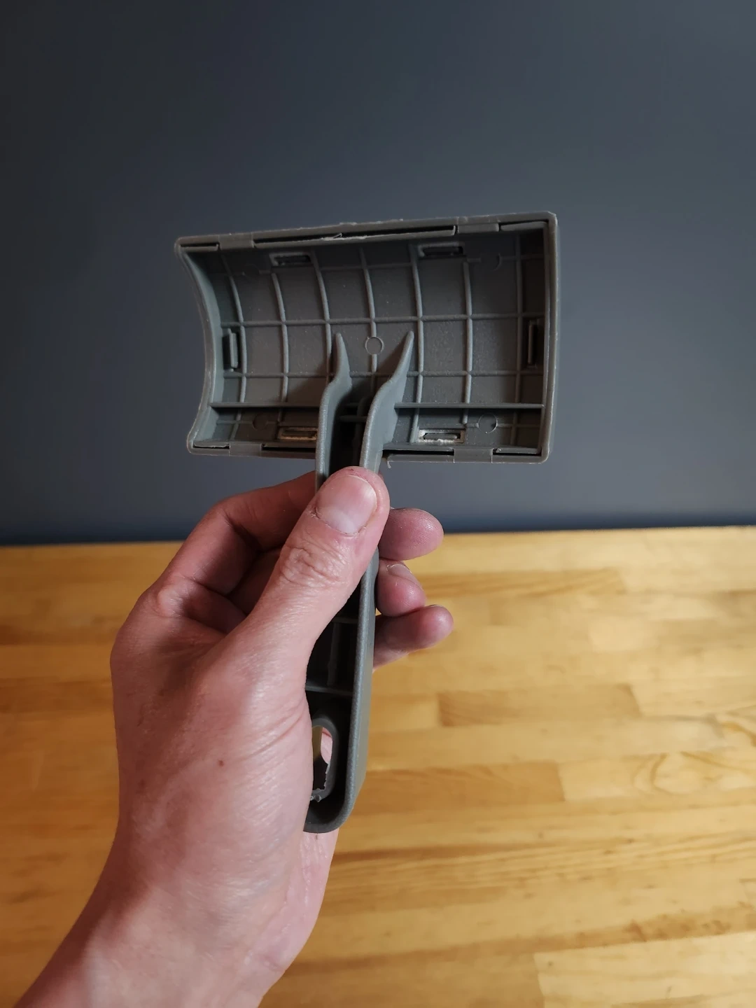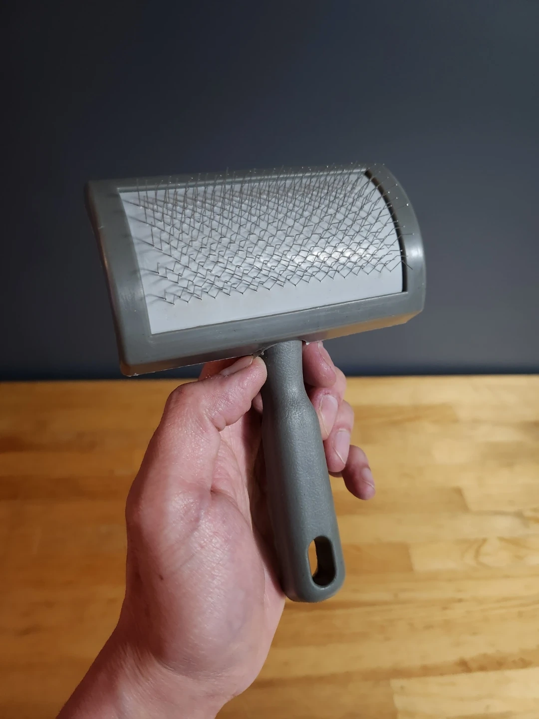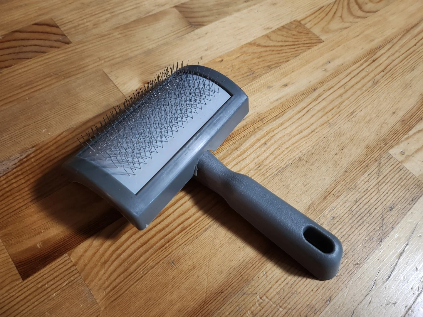 Curved Slicker Brush, a staple for pet grooming. While the exact brand isn't printed on the plastic, this specific design—characterized by the grey textured handle, the reinforced "grid" on the back, and the bent metal pins. Designed as a generic professional-grade groomer's slicker.