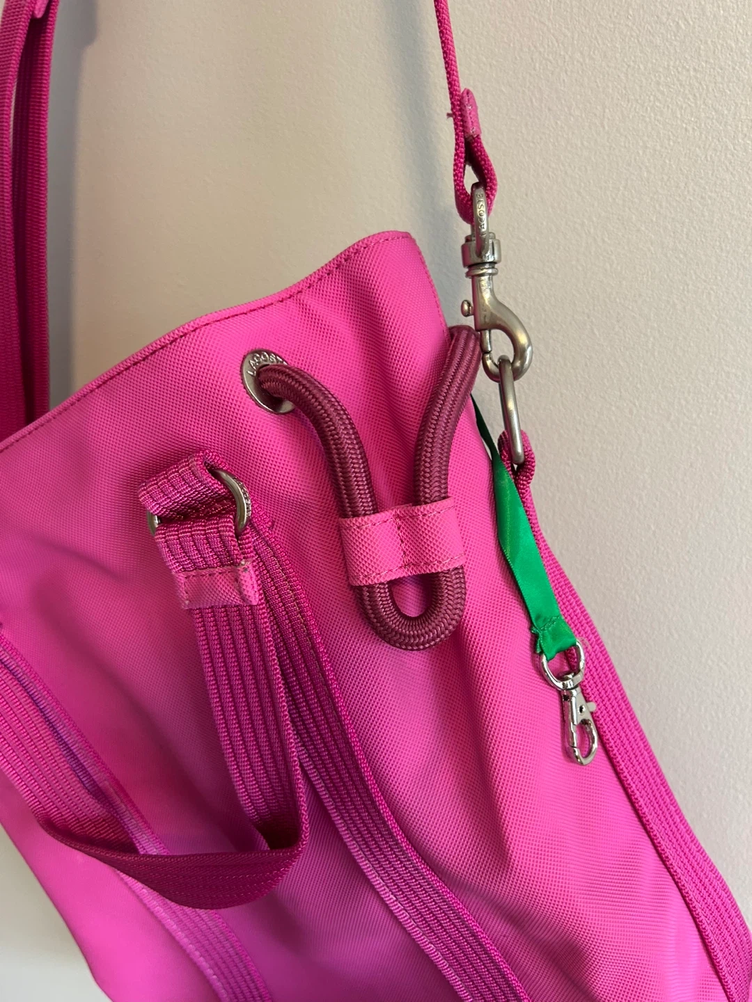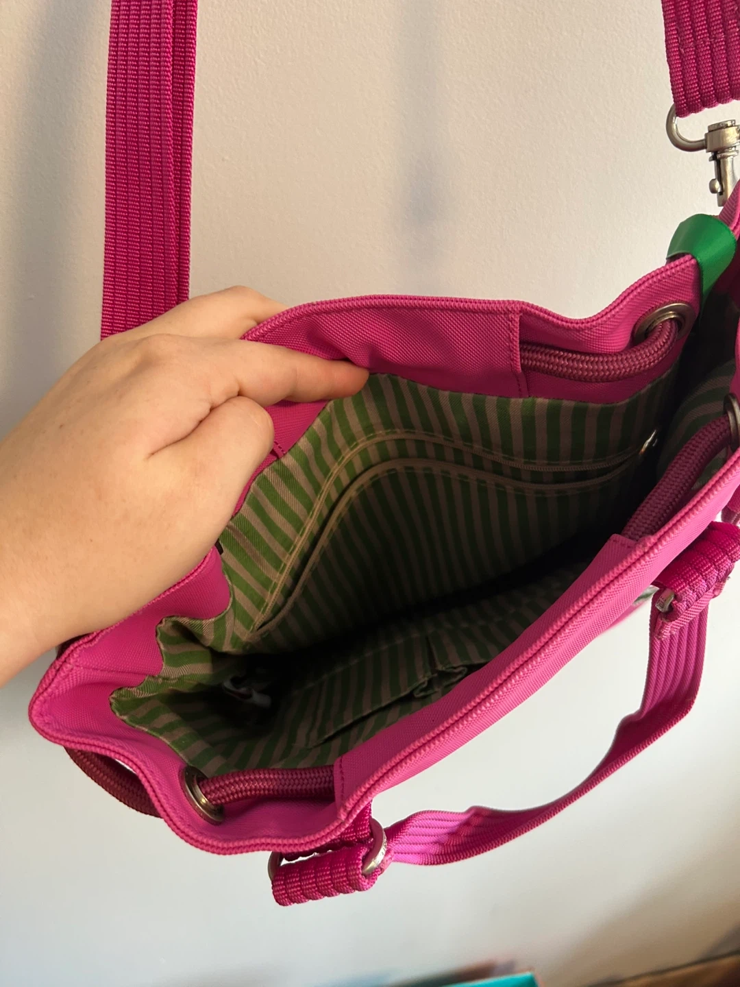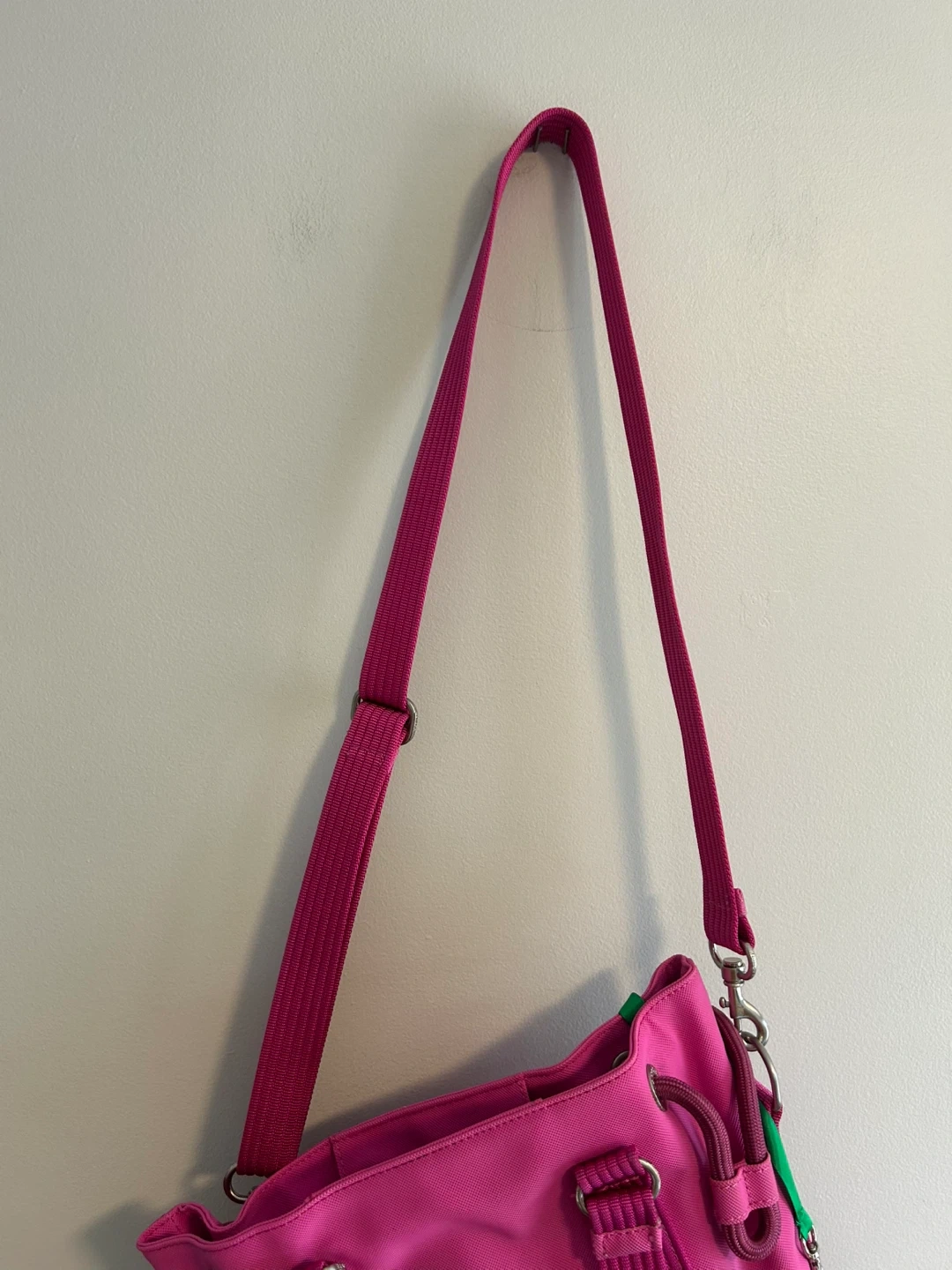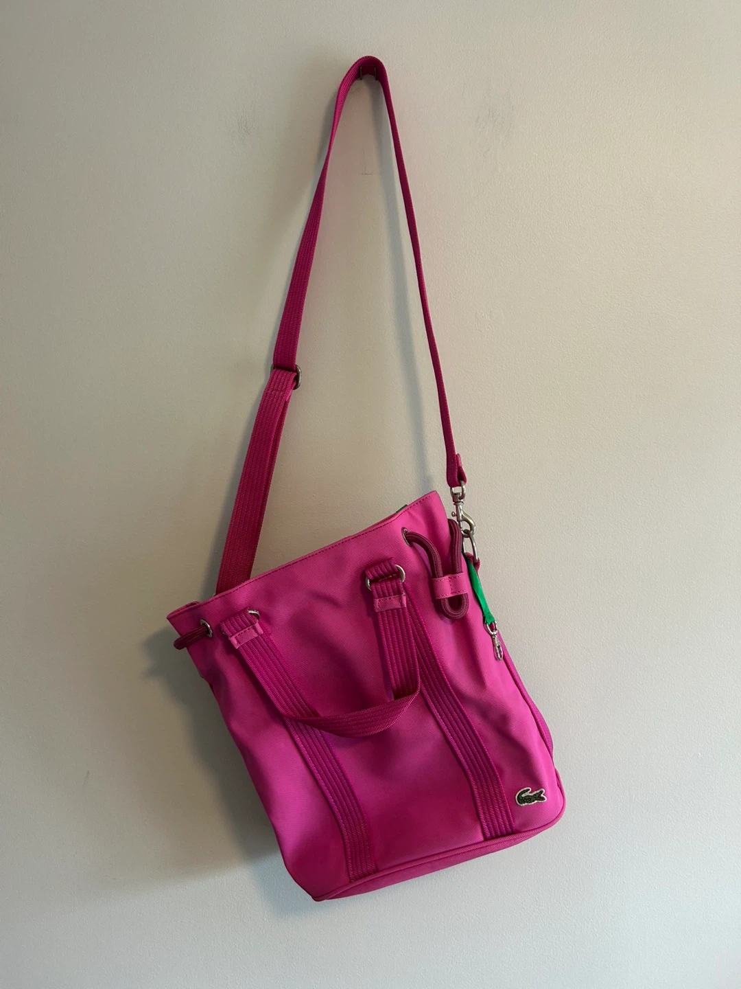 Lacoste brand. Cross body tote canvas purse. Pink in colour with green stripes inside. Brand new condition $50