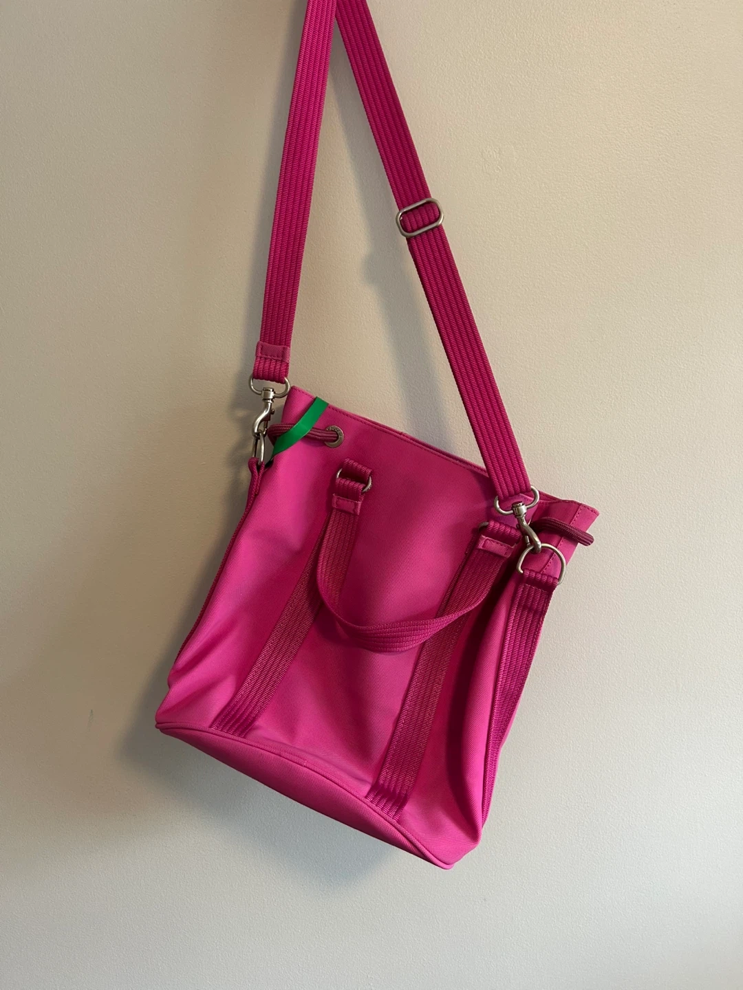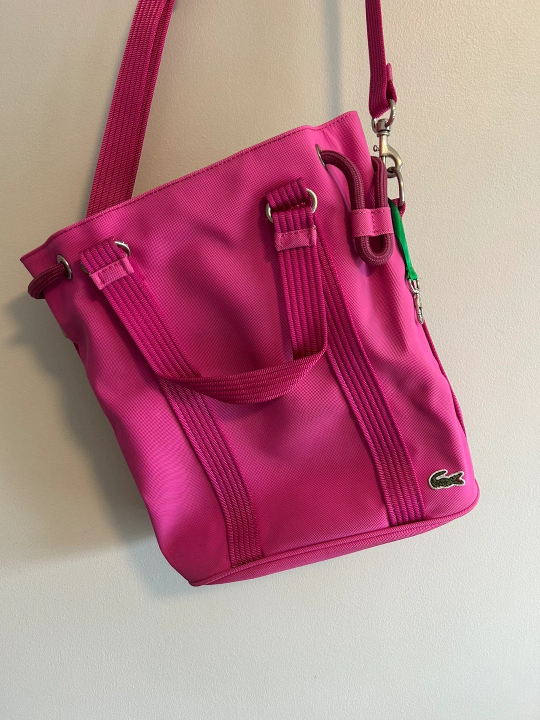 Lacoste brand. Cross body tote canvas purse. Pink in colour with green stripes inside. Brand new condition $50