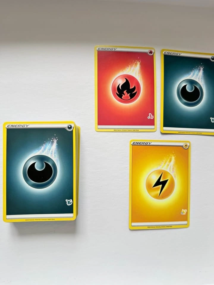 Clean bundle of Pokemon TCG energy cards. Has fire, lightning, and a stack of dark energy cards. All cards are from 2020. Great for players or collectors.
