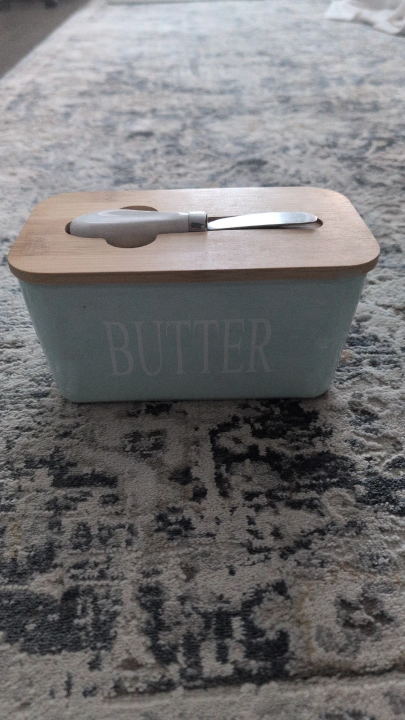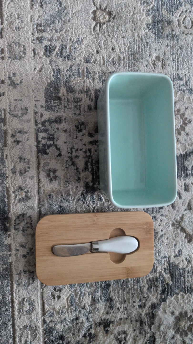 Ceramic butter dish in a light blue colour with a wooden lid and a butter knife. The lid has a slot for the knife. It's suitable for storing butter at room temperature or in the fridge.