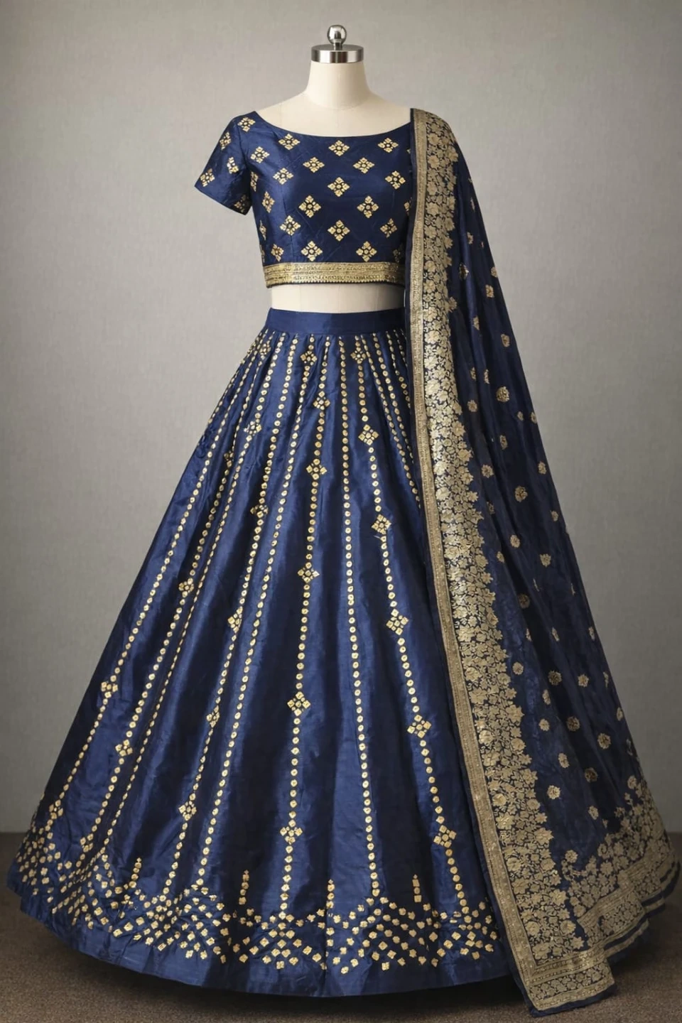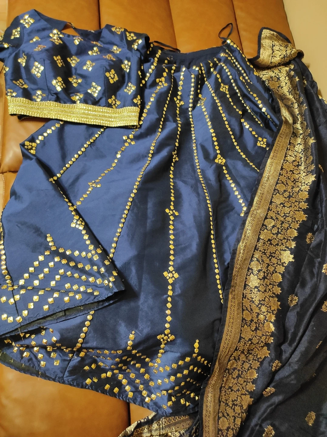 Beautiful navy blue lehenga choli set, complete with a matching dupatta. This outfit features intricate gold embroidery all over the skirt and blouse. It's made from a satin-like material for a lovely sheen. Perfect for special occasions and celebrations!