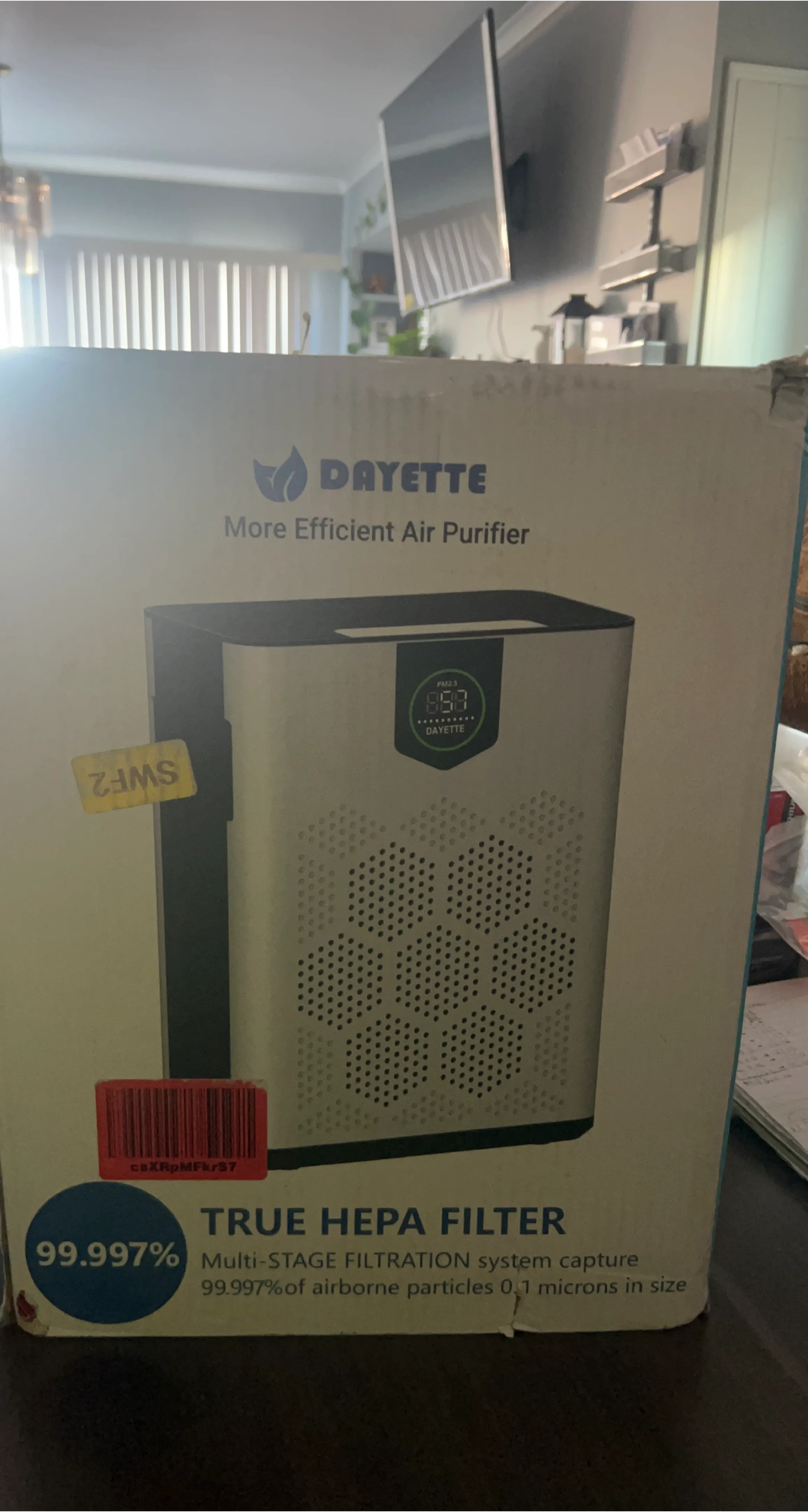 This DAYETTE air purifier features a True HEPA filter with multi-stage filtration. It captures 99.997% of airborne particles 0.1 microns in size. Its display shows PM2.5 levels.