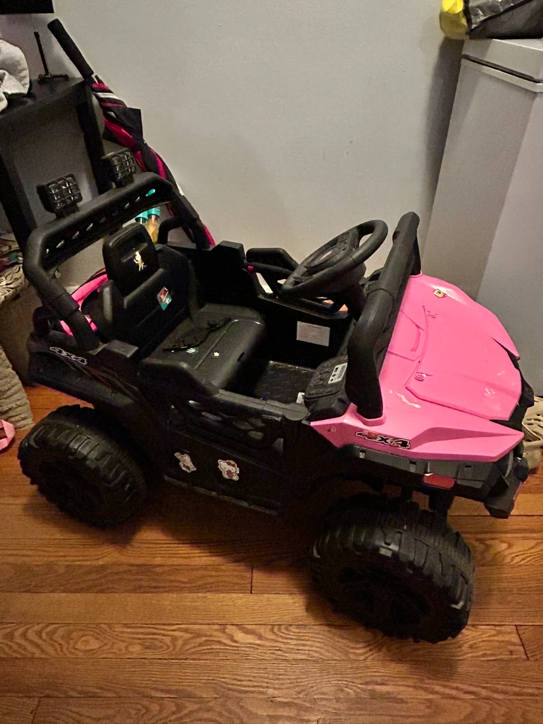 Kids ride-on UTV with a fun pink color. It's a 4x4 style toy car perfect for outdoor adventures. Bluetooth & AMFM radio are included for added play.