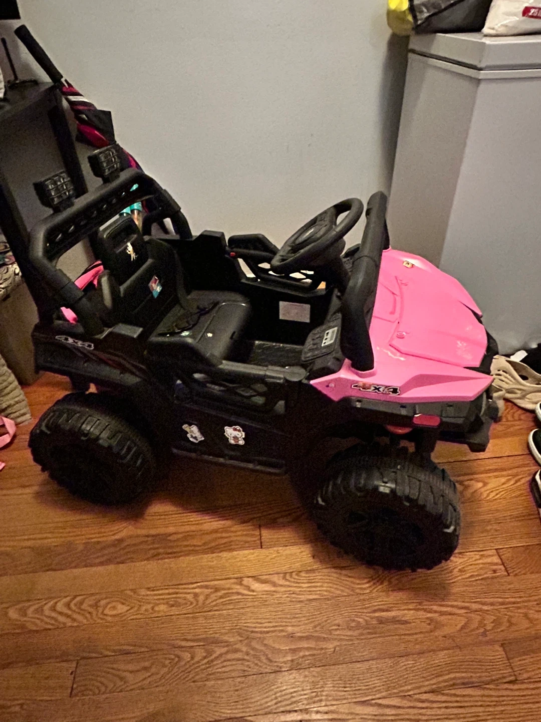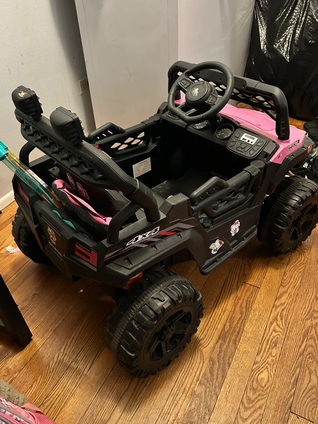 Kids ride-on UTV with a fun pink color. It's a 4x4 style toy car perfect for outdoor adventures. Bluetooth & AMFM radio are included for added play.