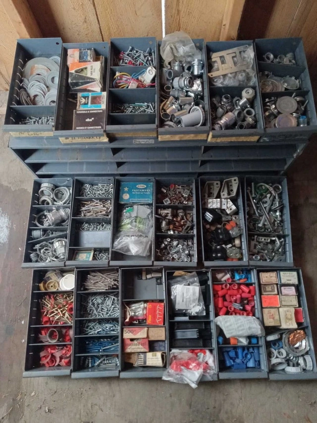 Was in a van, or could be great for a bench. Filled with material for electrical work. Dimensions are 34x11x12 inches. It should clean up, as far as bin markings, or you can just tape over them. I am open to offers, but a single item in here is over $10, and maybe the piece you need could be in your work or service situation. Cash accepted.