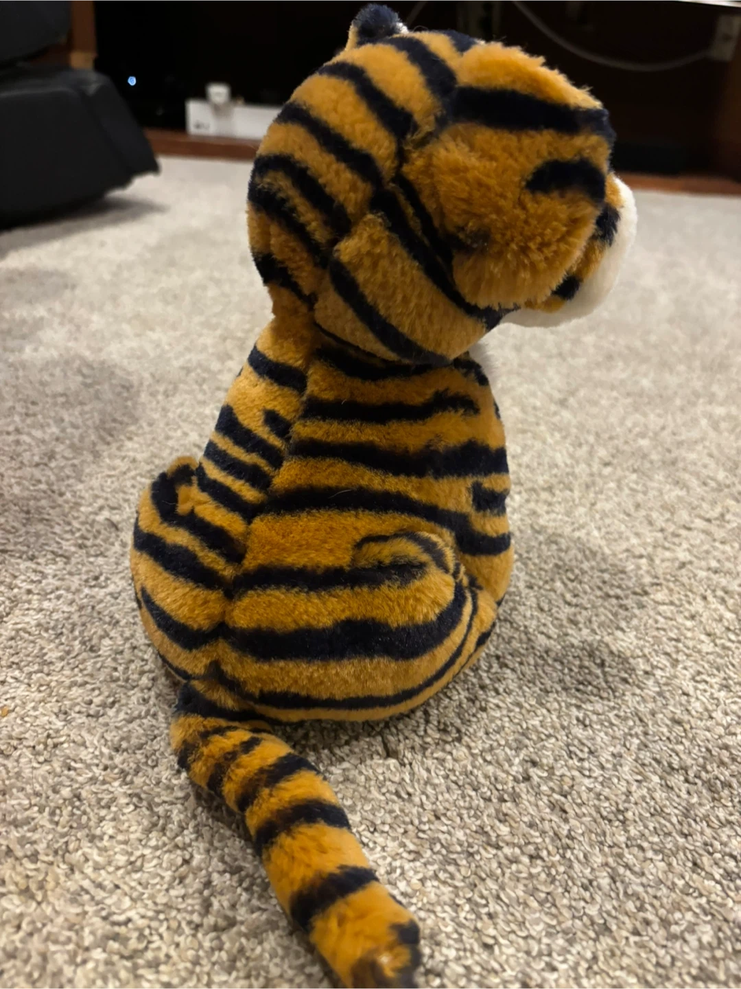 A cute plush tiger stuffed animal toy. It's orange with black stripes and white accents. Made from soft material, it's perfect for cuddling or display. Suitable for kids of all ages!
