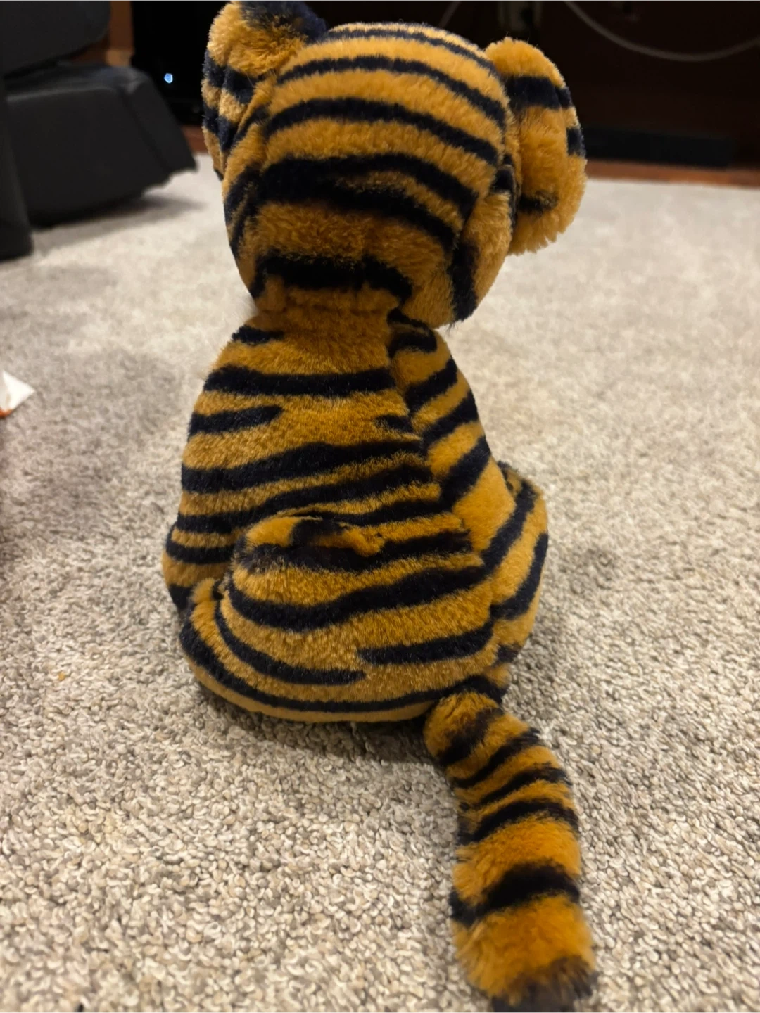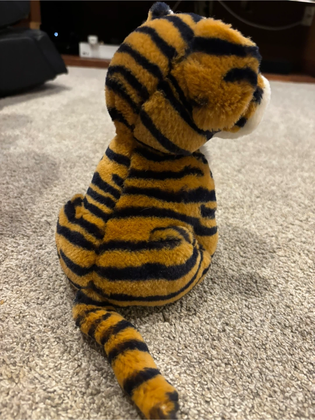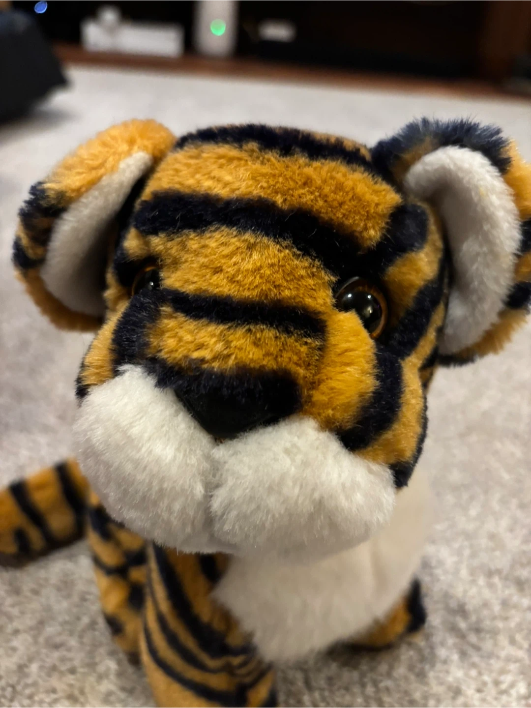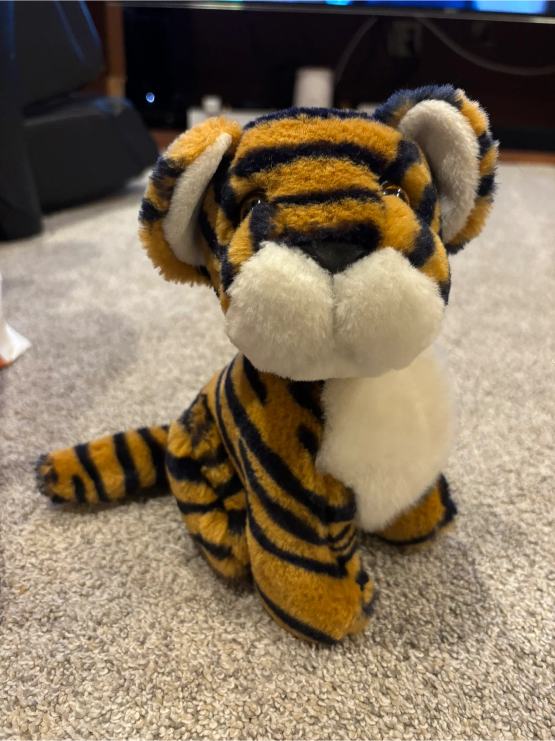 A cute plush tiger stuffed animal toy. It's orange with black stripes and white accents. Made from soft material, it's perfect for cuddling or display. Suitable for kids of all ages!