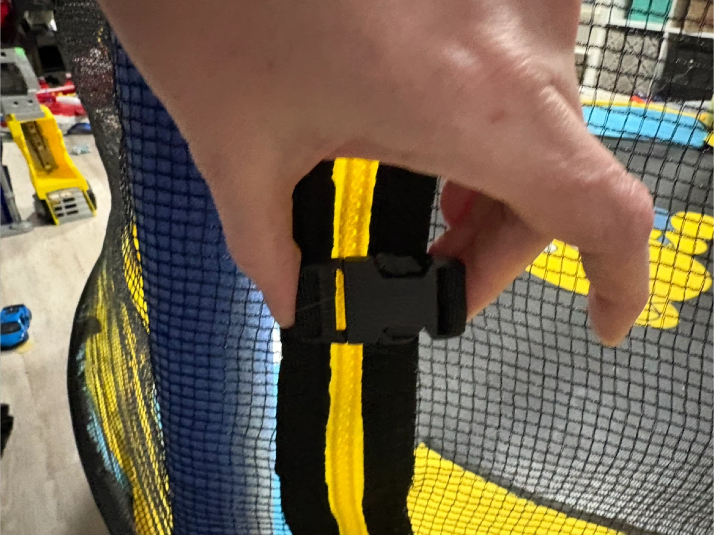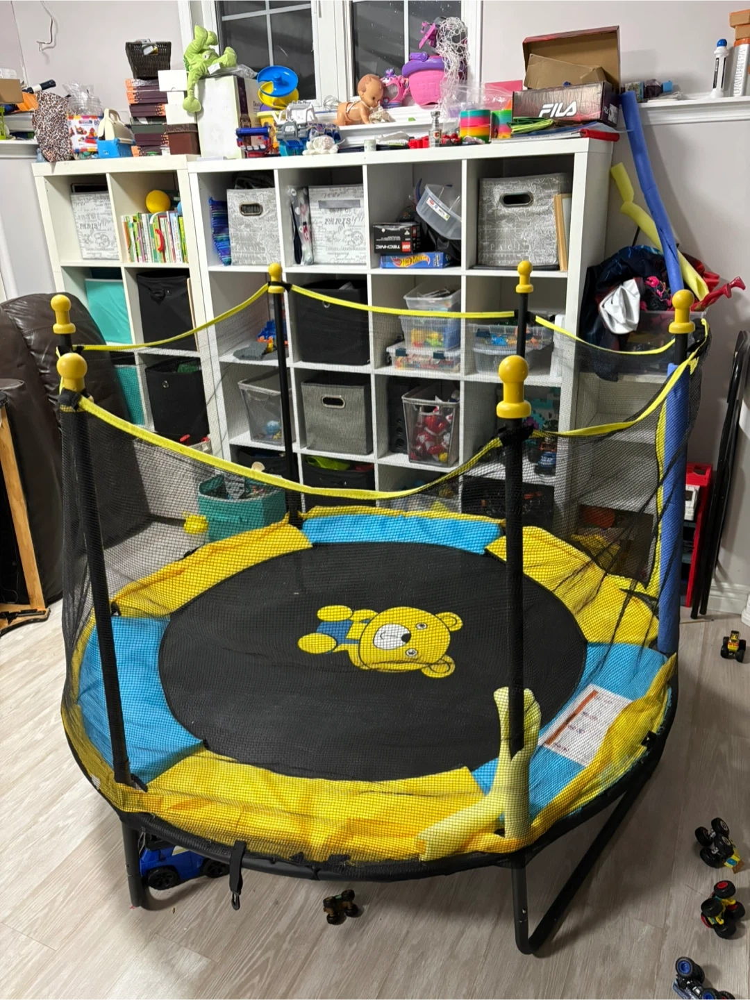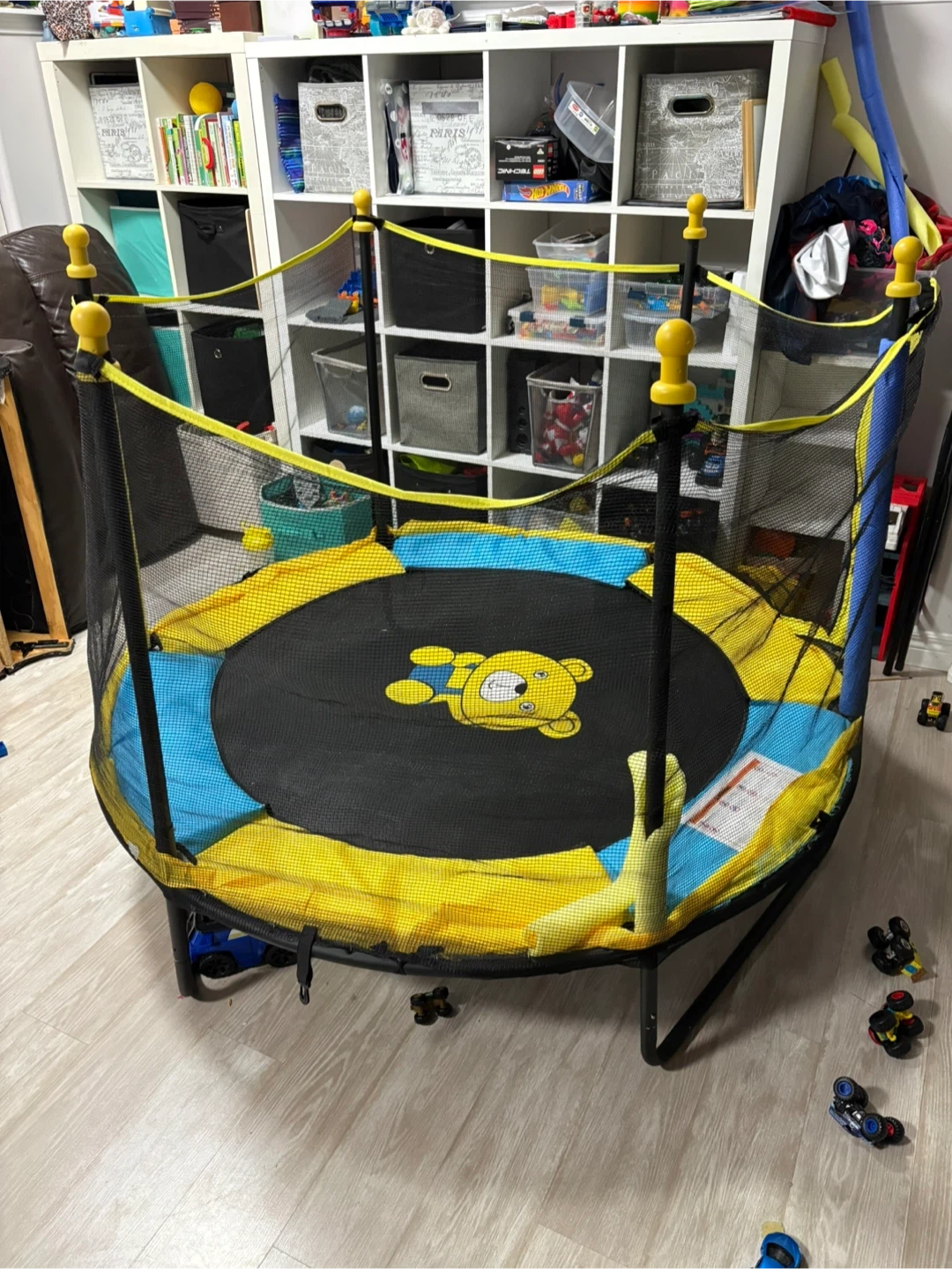 This colourful trampoline is great for little ones. It has a fun bear design on the mat and a safety net enclosure. It's perfect for indoor or outdoor bouncing fun!