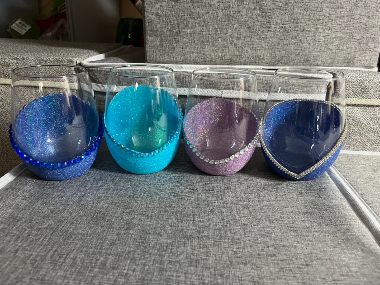 These four stemless wine glasses are uniquely decorated with glitter and rhinestones. They come in various sparkling colors like blue, teal, and purple. They're perfect for adding some sparkle to your next gathering!