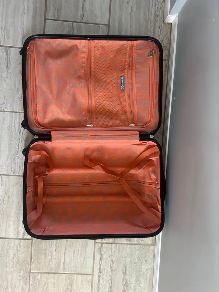 Functional VOYAGER X gray hard shell suitcase with 4 spinner wheels and a retractable handle. The interior is orange with mesh pockets and straps. Good for travel.