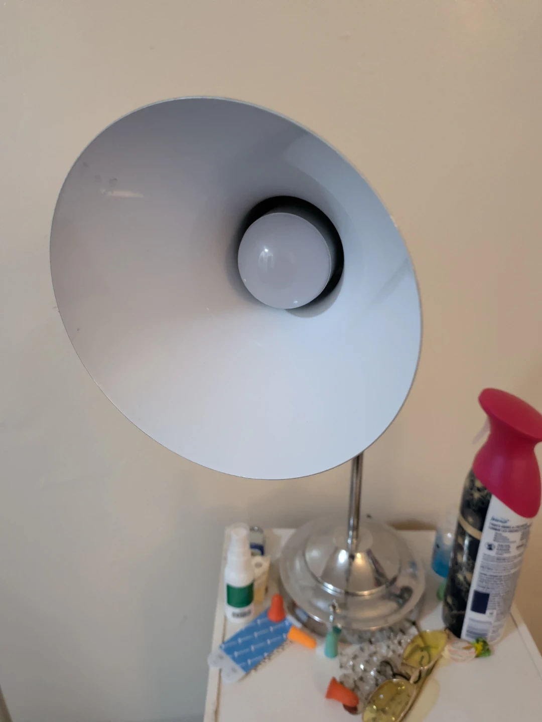 This gold desk lamp has an adjustable for easy positioning. It's perfect for a desk or nightstand. The lamp features a metal shade and base.