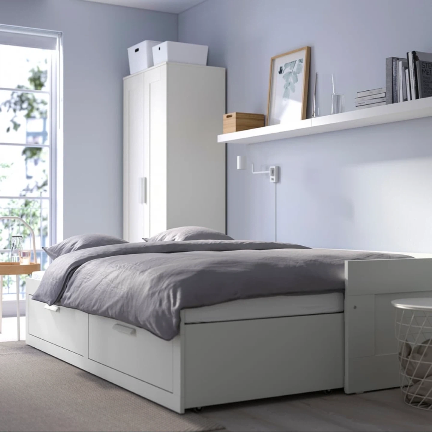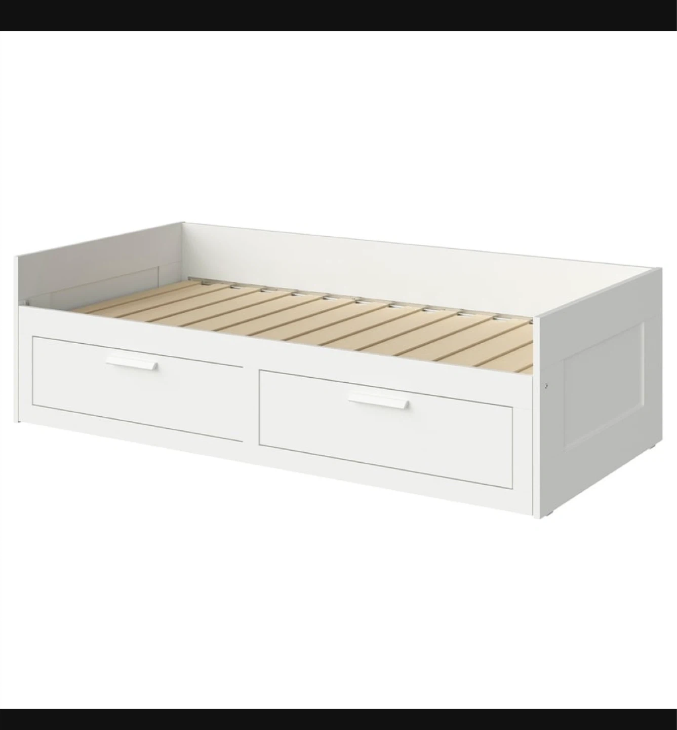 Selling a gently used IKEA daybed frame in white. This versatile piece is perfect for a guest room or living space, easily converting from a sofa to a single or double bed. It features handy drawers for extra storage, making it a practical and stylish addition to any home