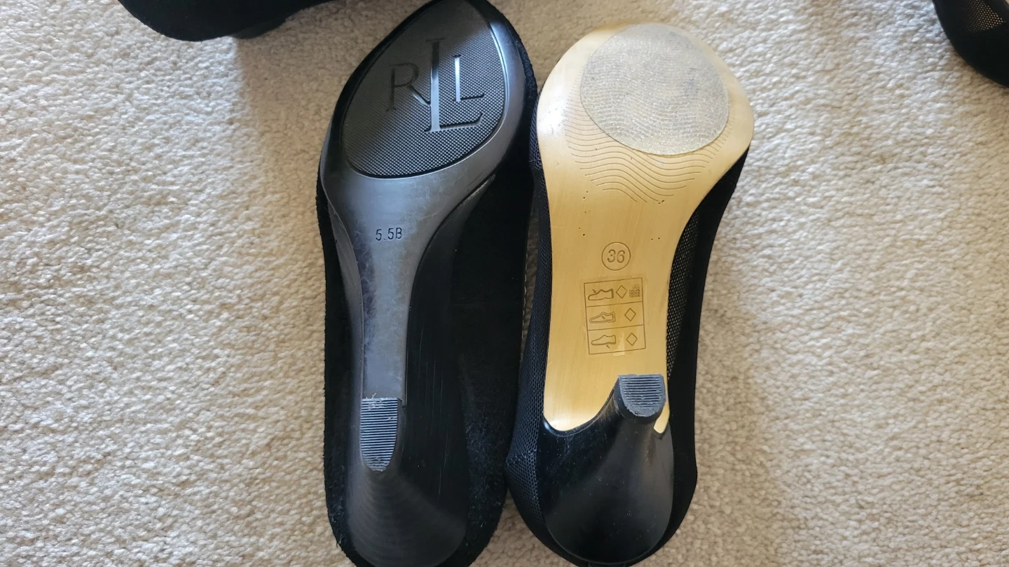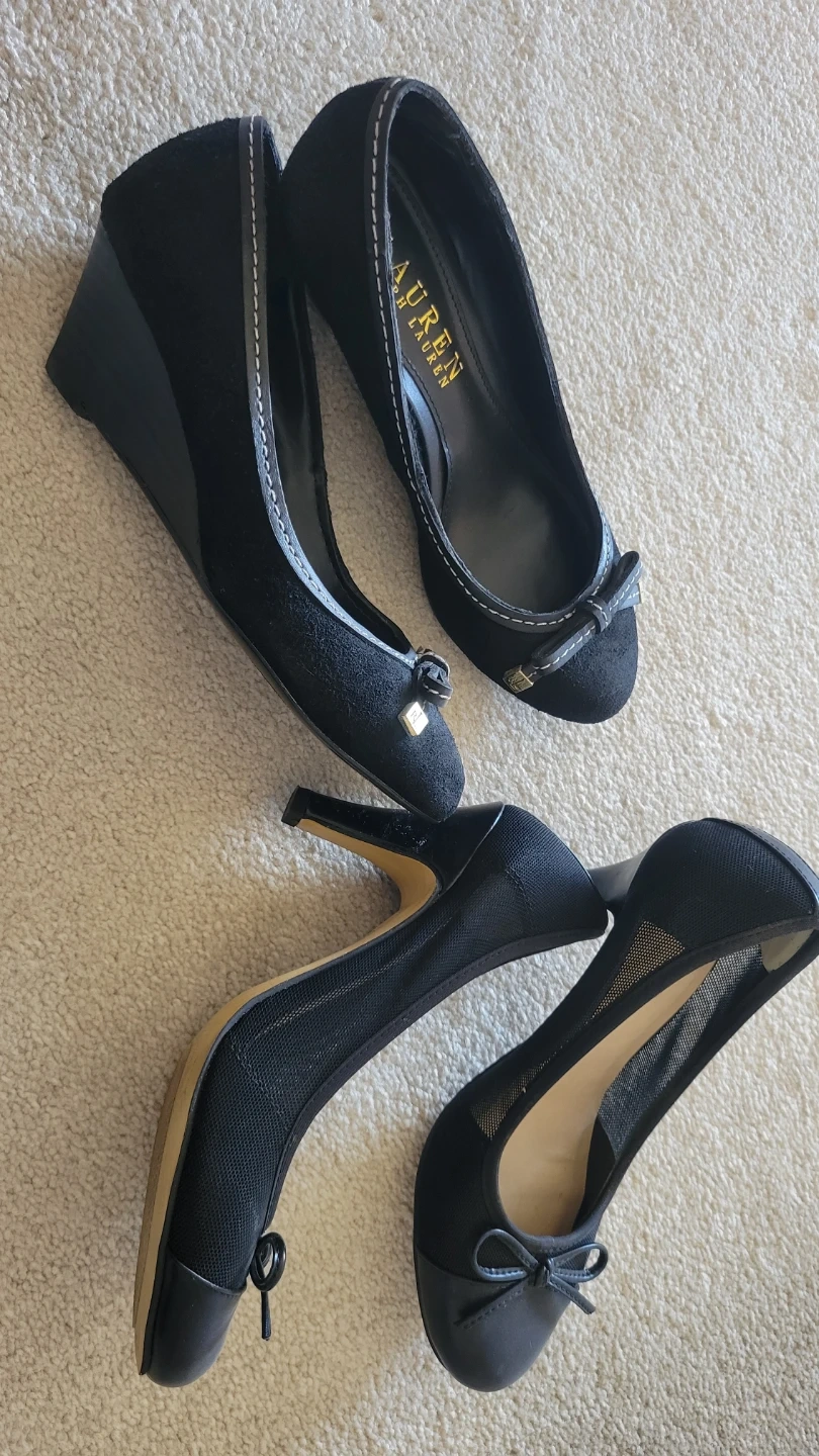 Two pairs of black women's shoes. One pair is Lauren Ralph Lauren ballet flats with a bow accent. The other pair is K Studio pumps with a mesh design and bow detail. Both are size 5.5B (US women's) / 36 (European). Price for each