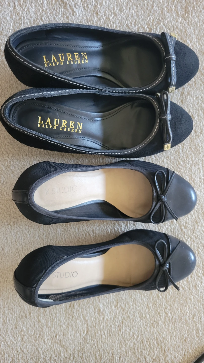 Two pairs of black women's shoes. One pair is Lauren Ralph Lauren ballet flats with a bow accent. The other pair is K Studio pumps with a mesh design and bow detail. Both are size 5.5B (US women's) / 36 (European). Price for each