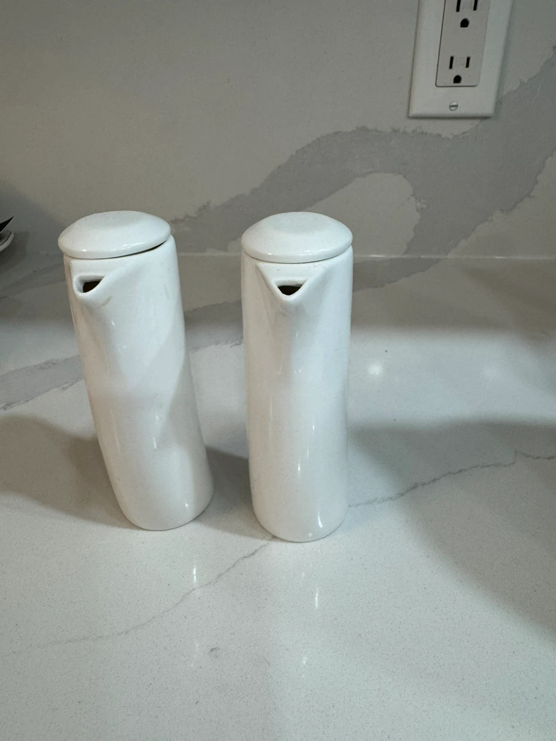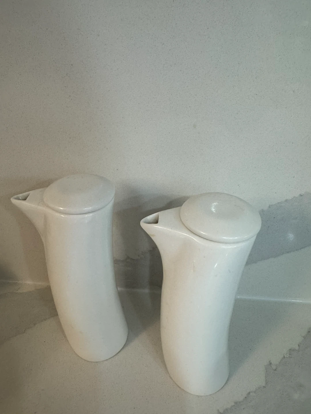A set of two matching white ceramic creamer or sauce pitchers. They feature a classic design with a spout and lid. White ceramic material.