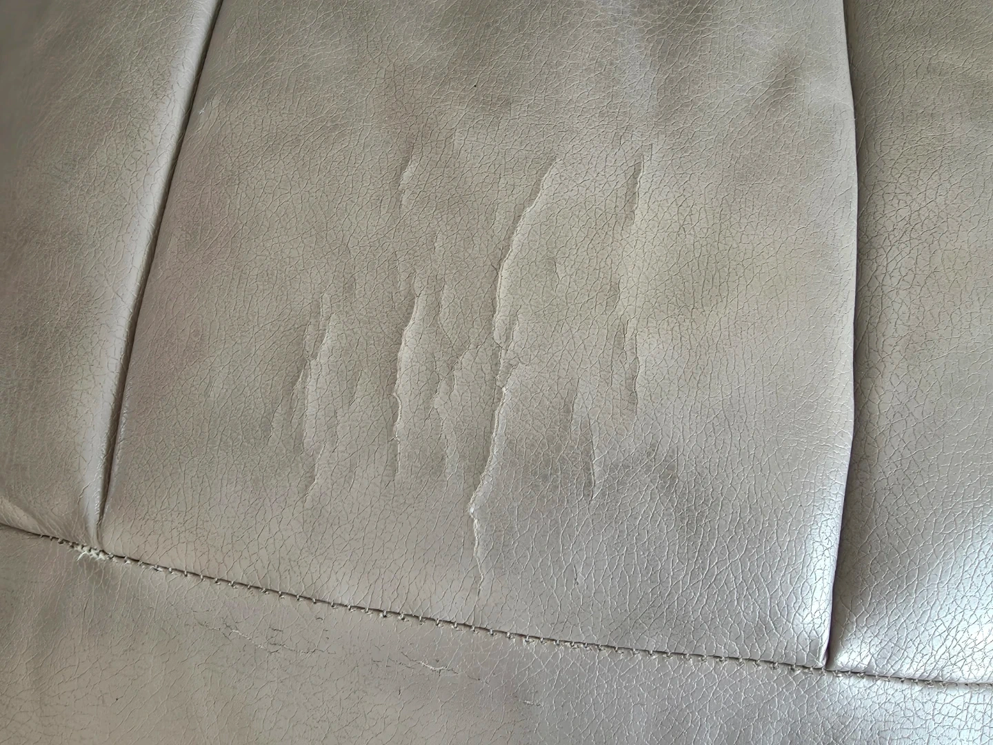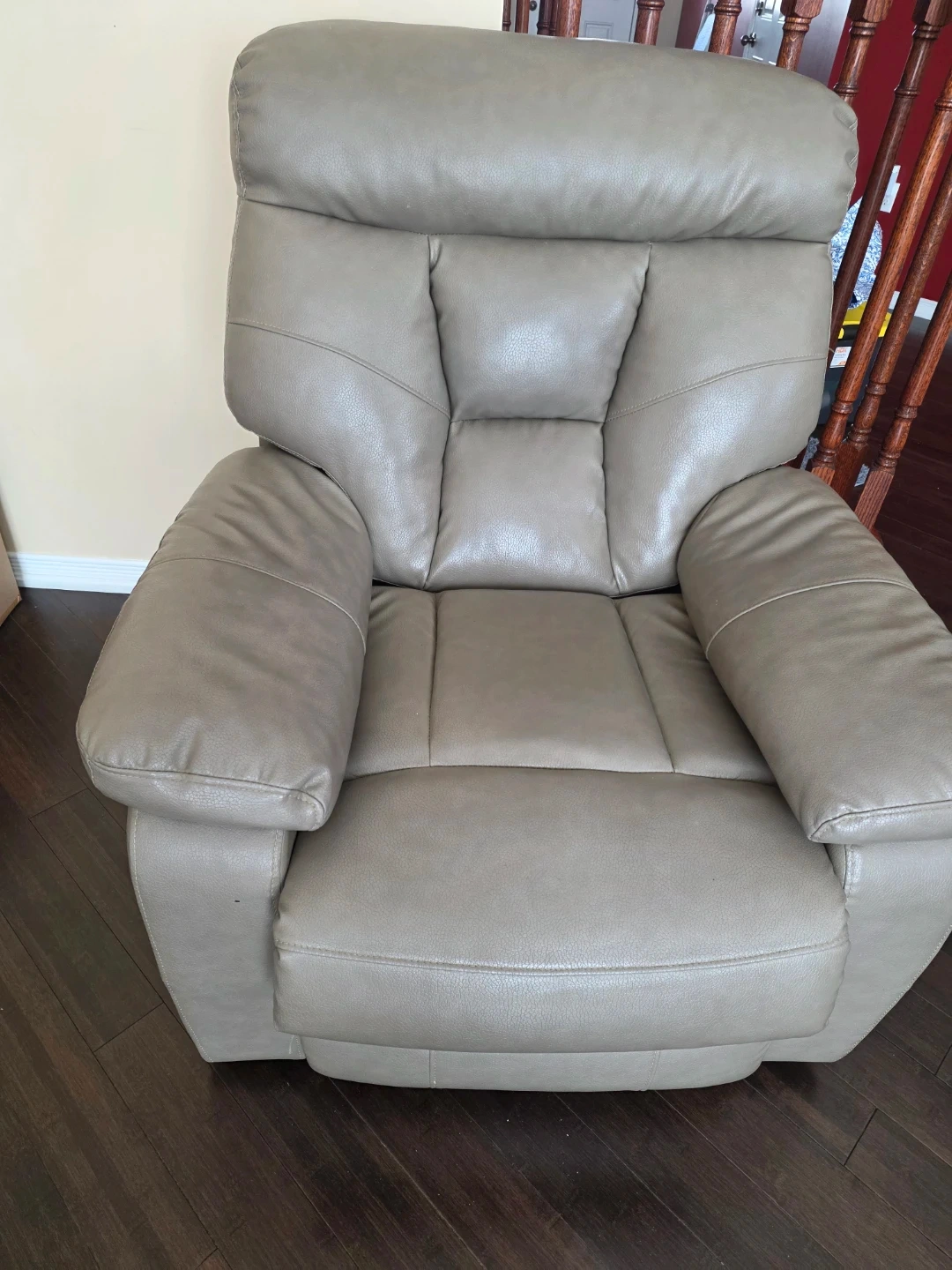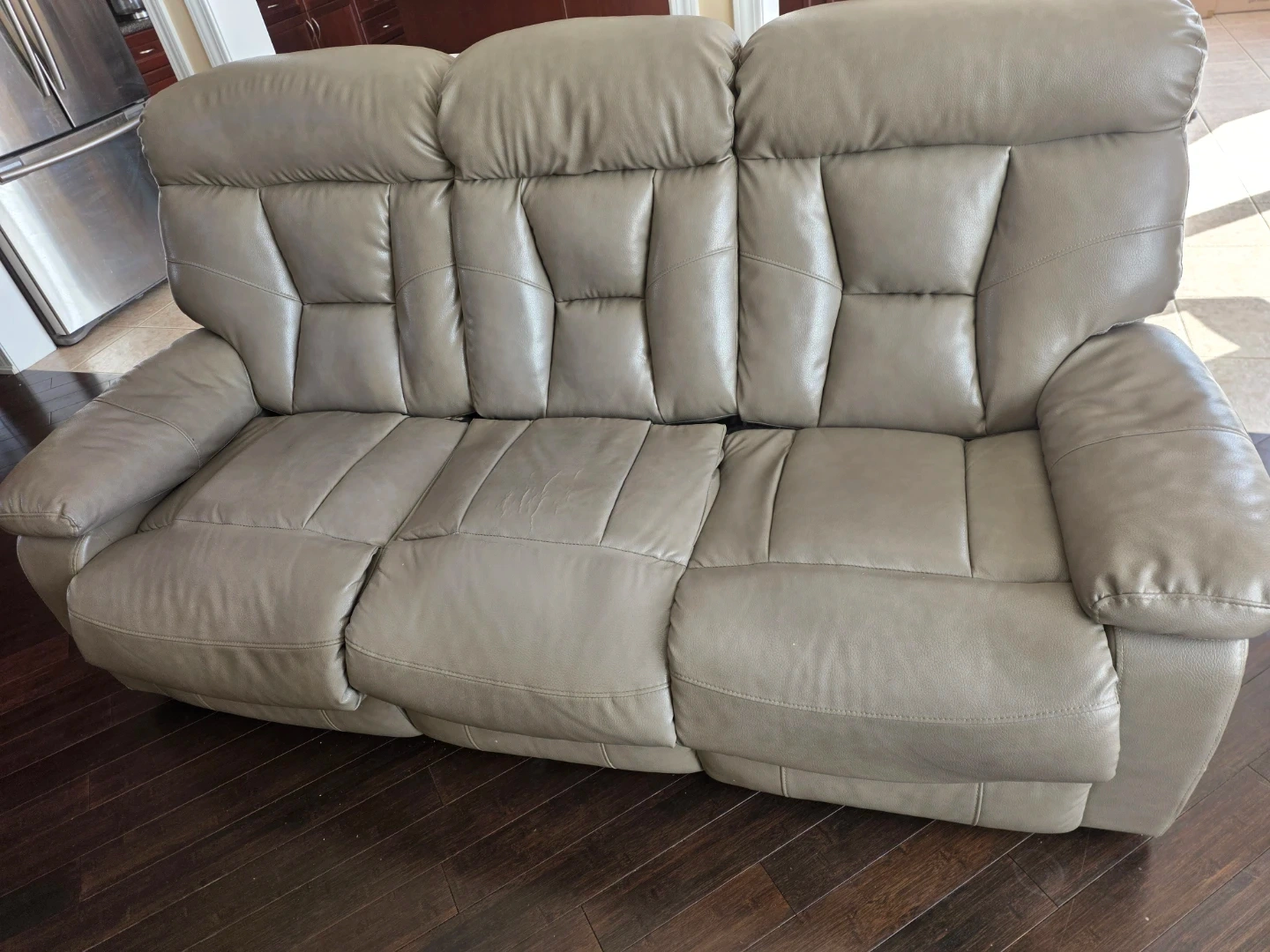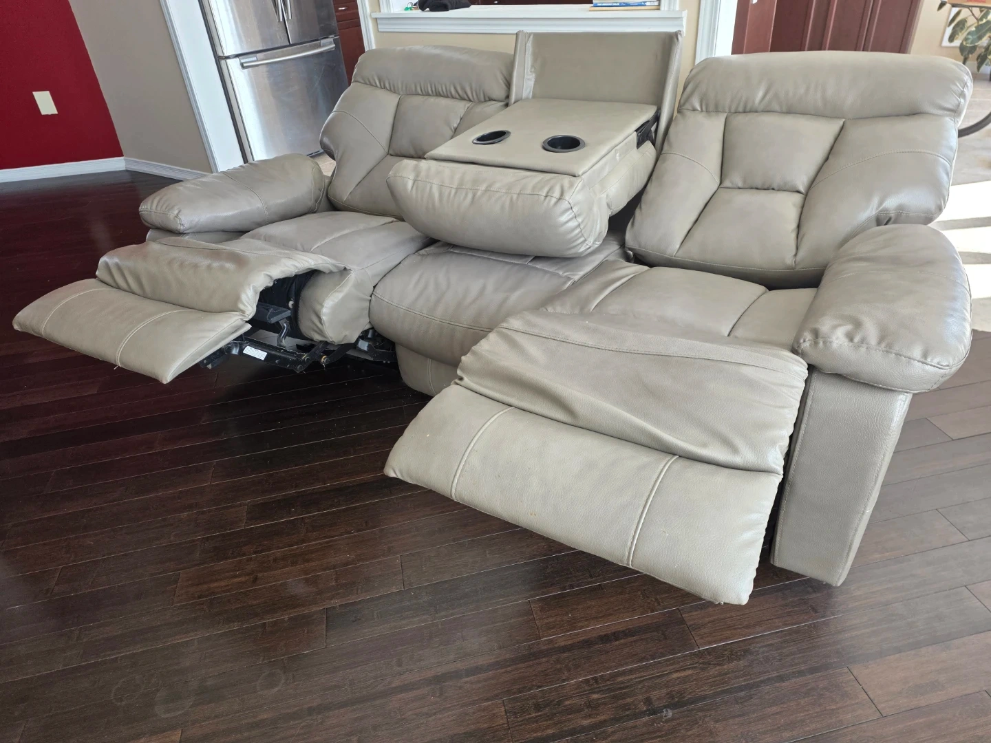 This three-seater reclining sofa offers comfortable seating and convenient cup holders. The material is faux leather, there are some signs of wear as shown in the pictures. Reclines smoothly for relaxation. It's a great option for a family room or home theatre.