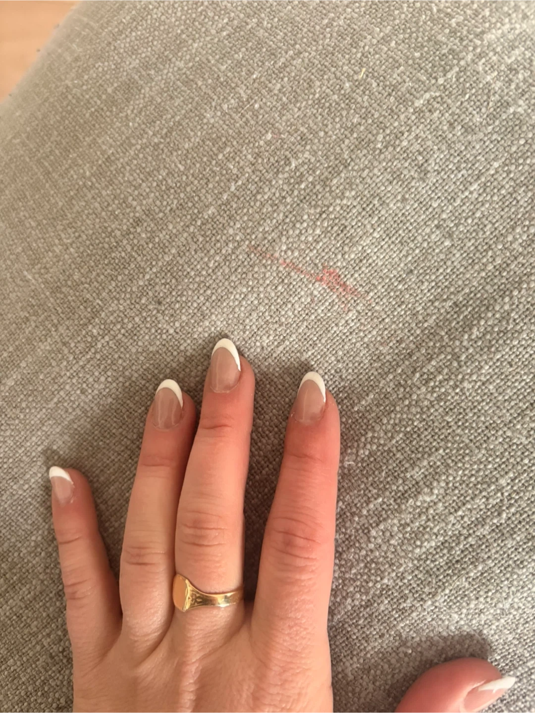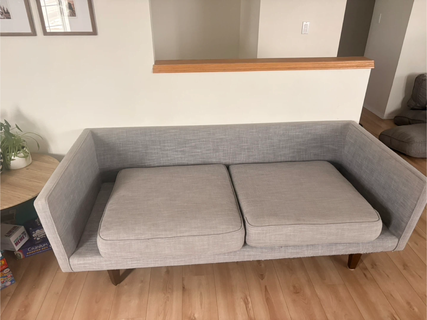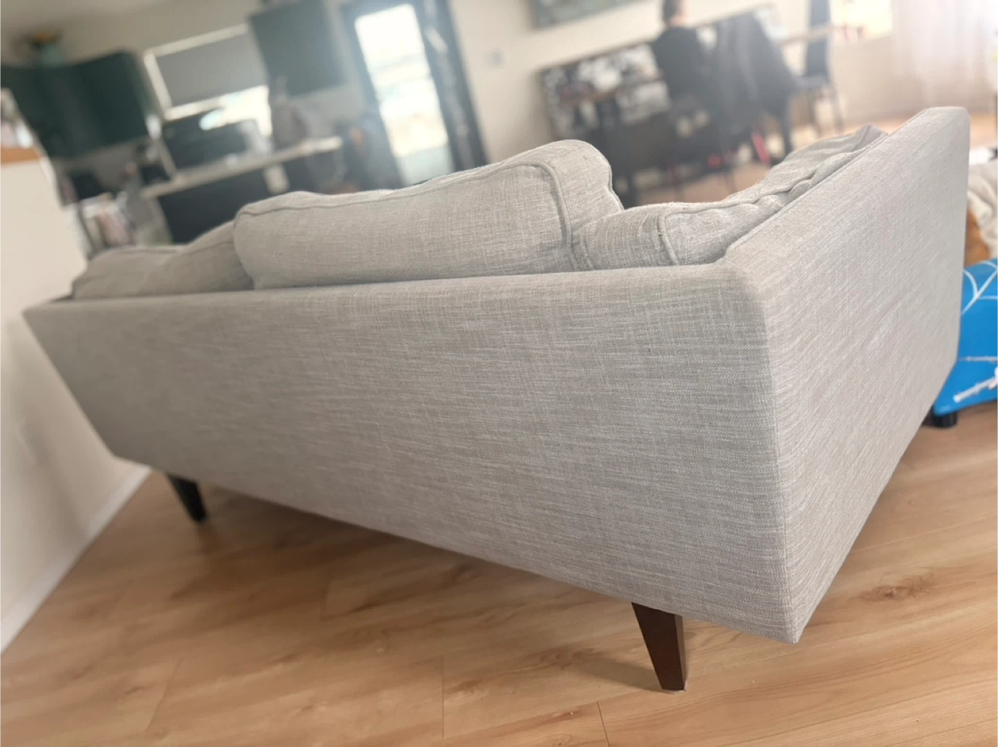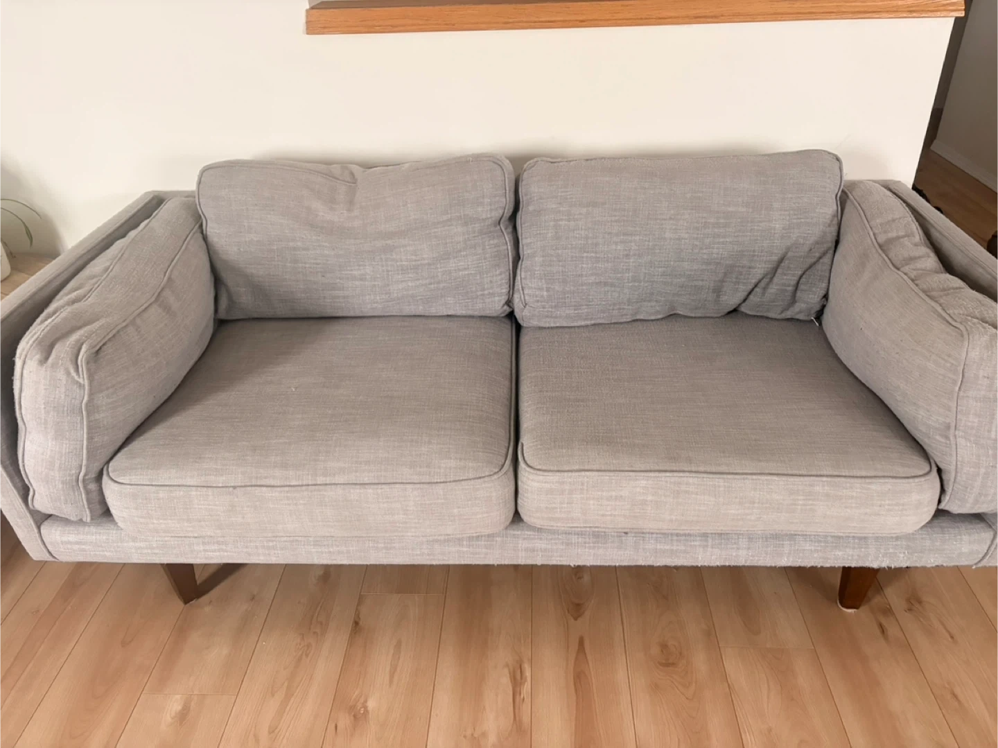 Grey fabric loveseat sofa with wooden legs. It has some minor signs of wear, including a small pink mark on one of the cushions. The underside has some fraying from the cat.