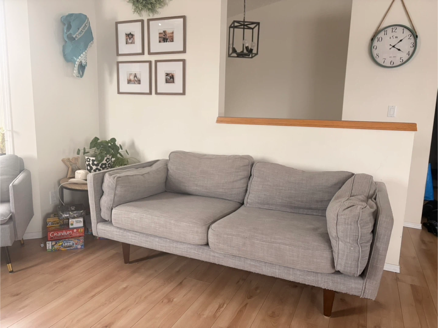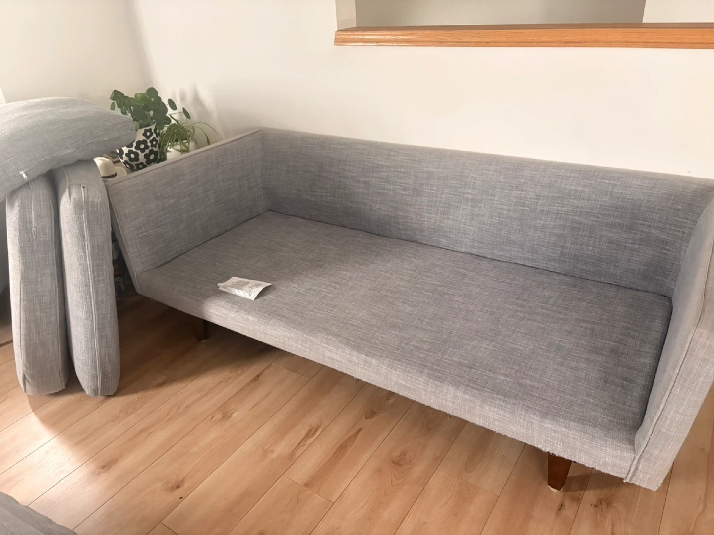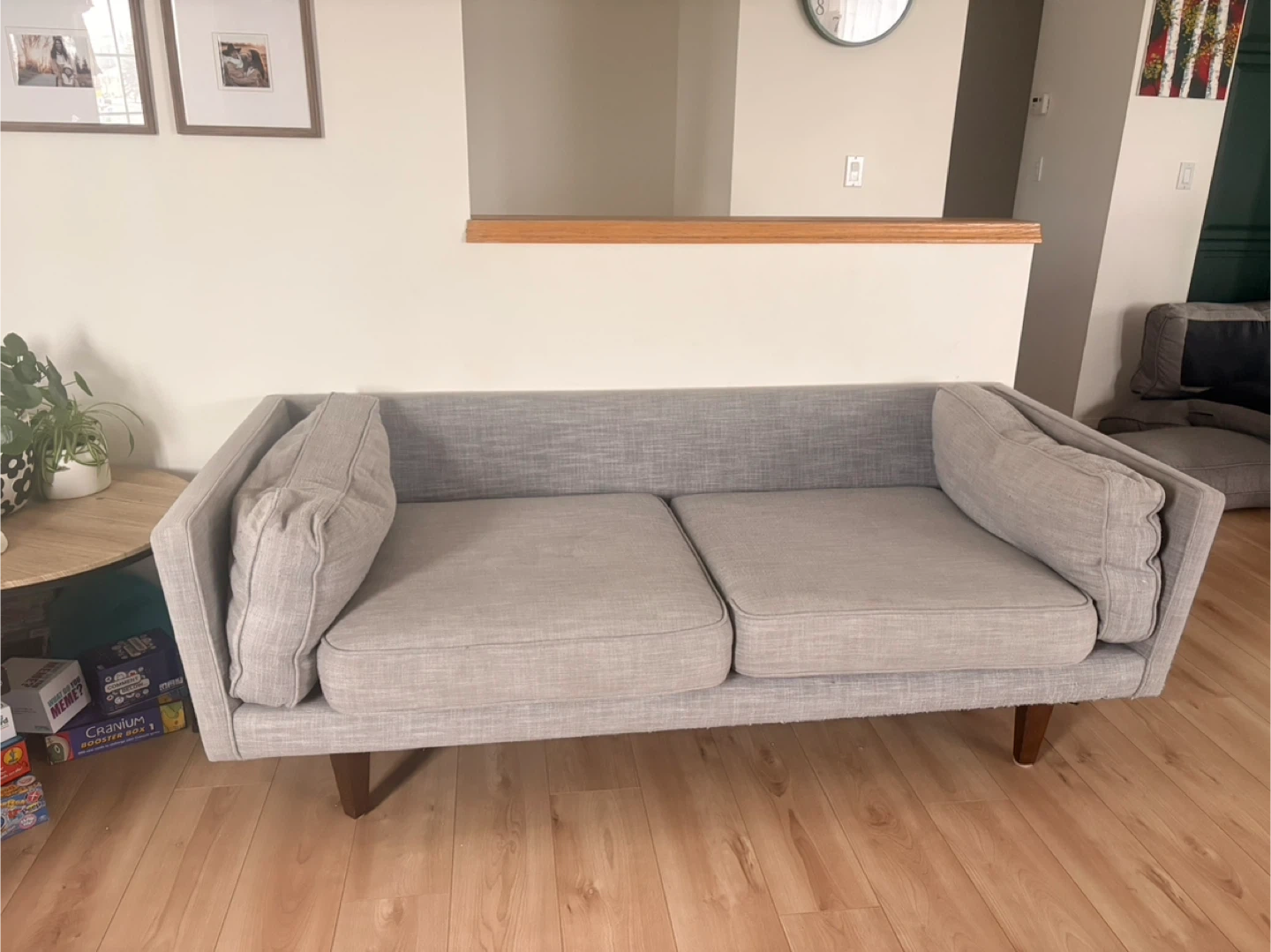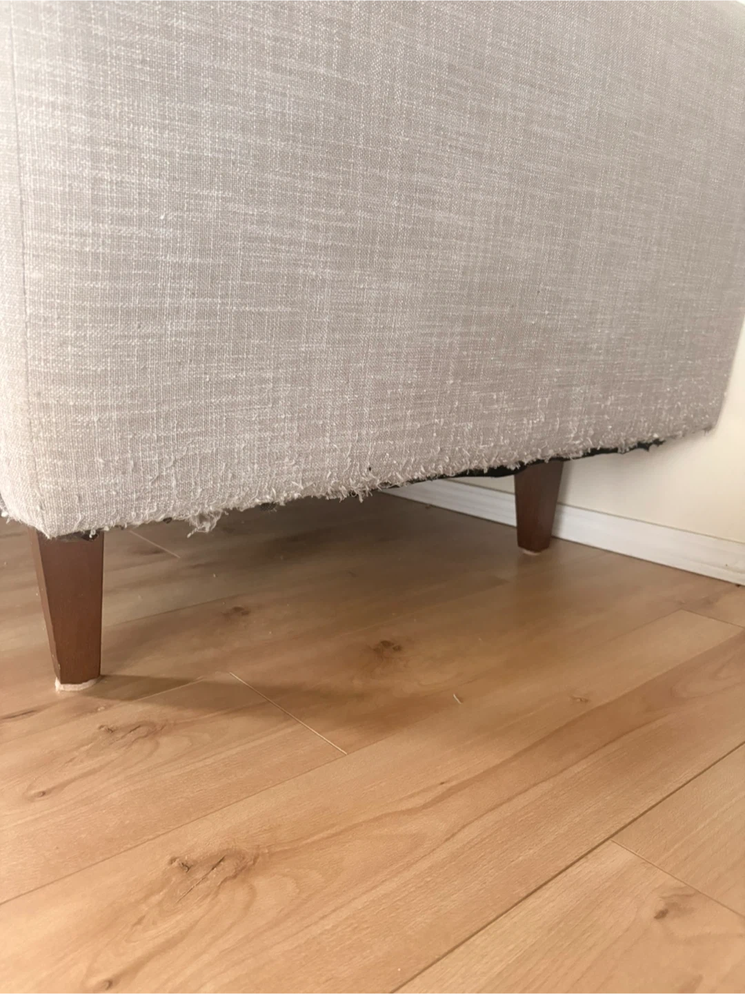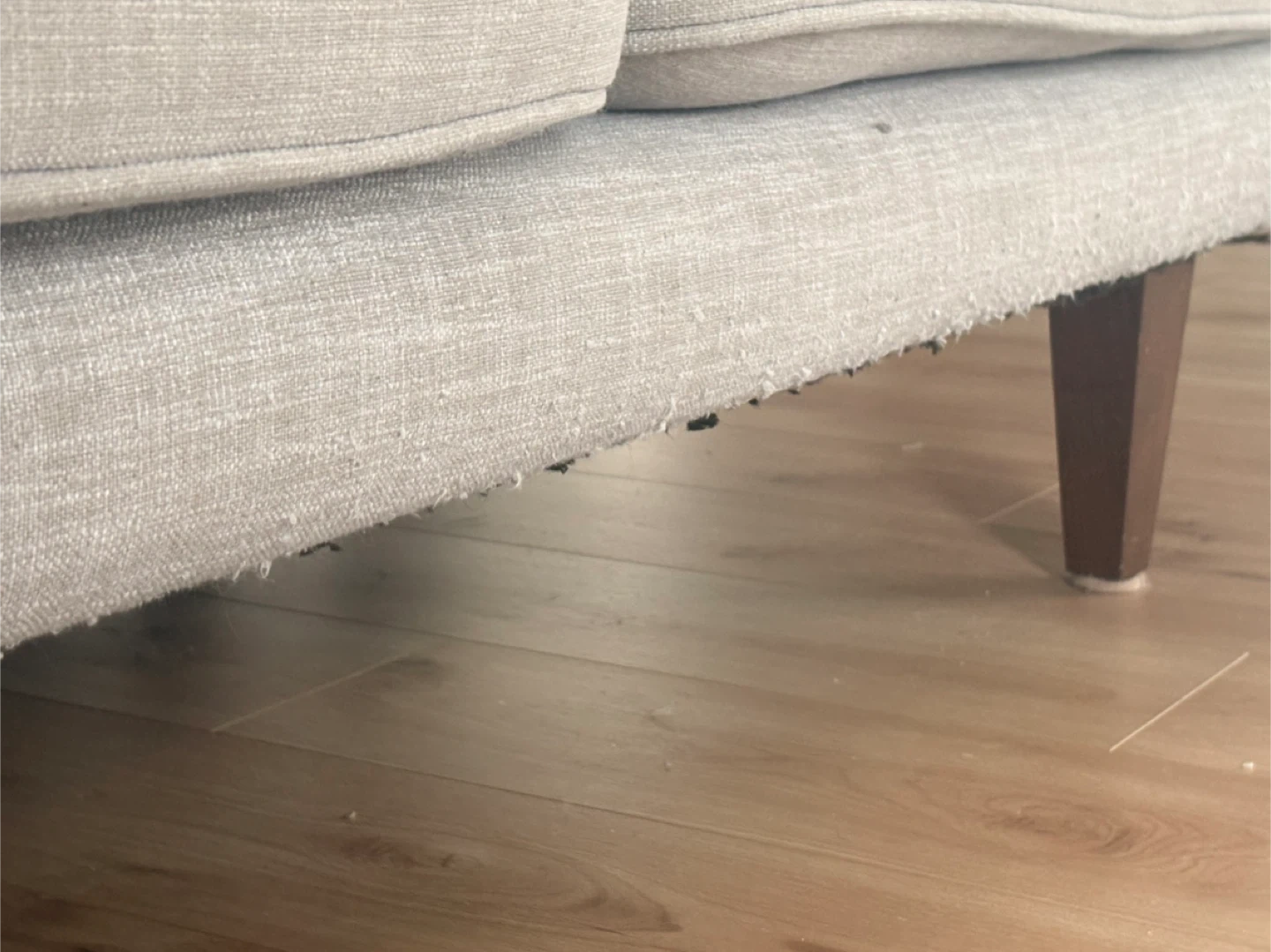 Grey fabric loveseat sofa with wooden legs. It has some minor signs of wear, including a small pink mark on one of the cushions. The underside has some fraying from the cat.