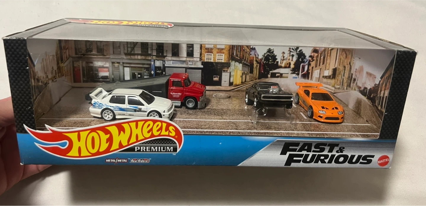 Selling a Hot Wheels Premium set from the Fast & Furious series! The set includes four die-cast cars, each with detailed designs and rolling wheels. Perfect for collectors or fans of the movies!