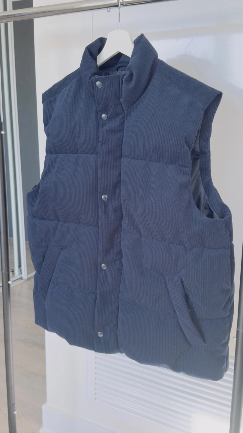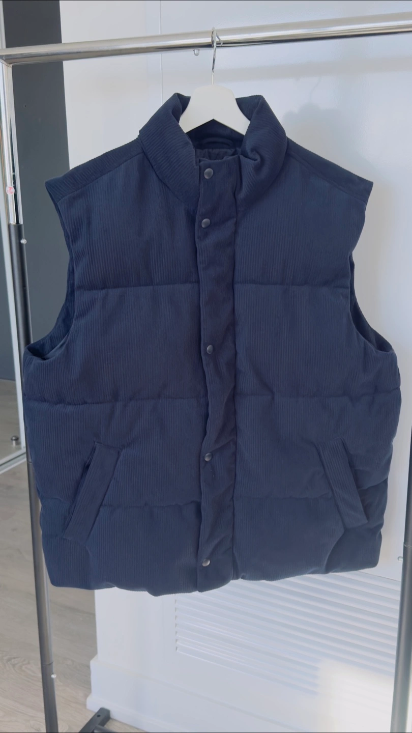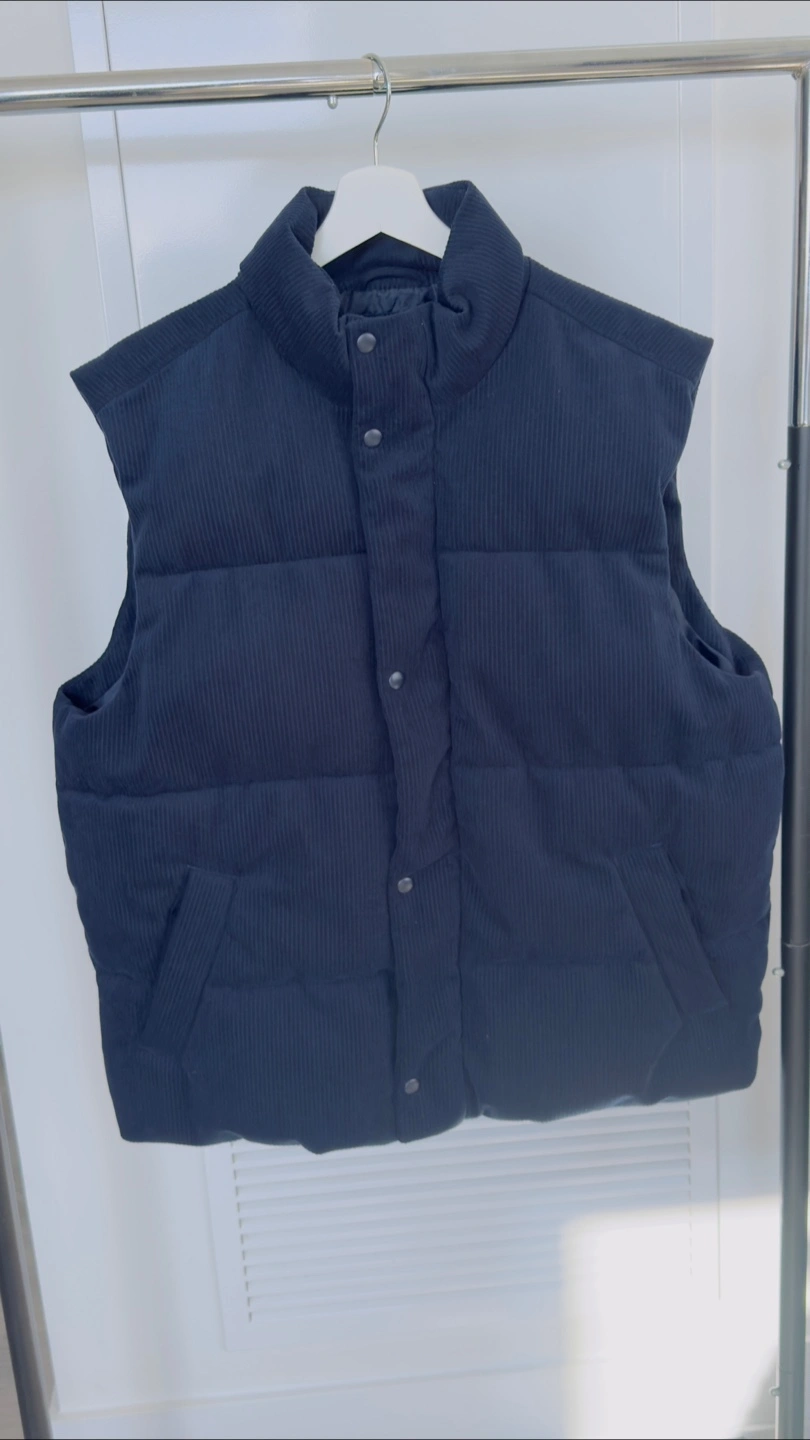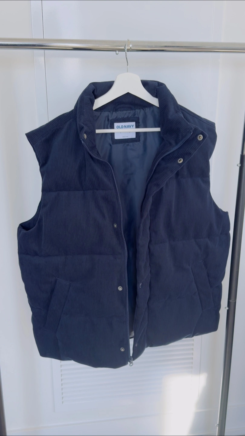 This Old Navy puffer vest is a versatile navy blue. It's made from a comfy corduroy material with a quilted design. Two front pockets are included for convenience. It's great for layering on cooler days!