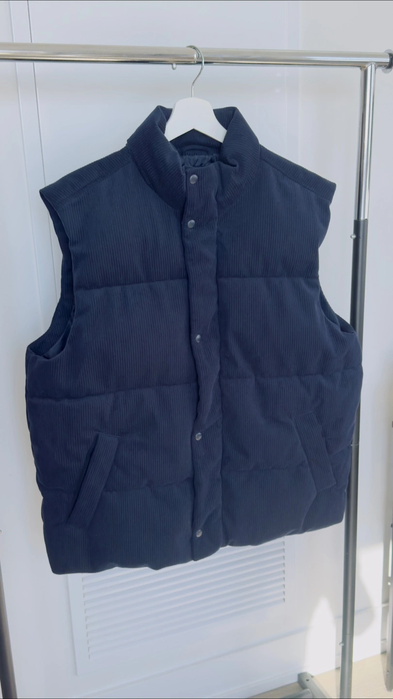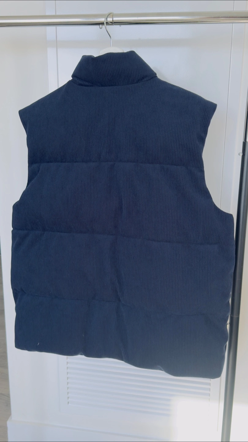 This Old Navy puffer vest is a versatile navy blue. It's made from a comfy corduroy material with a quilted design. Two front pockets are included for convenience. It's great for layering on cooler days!