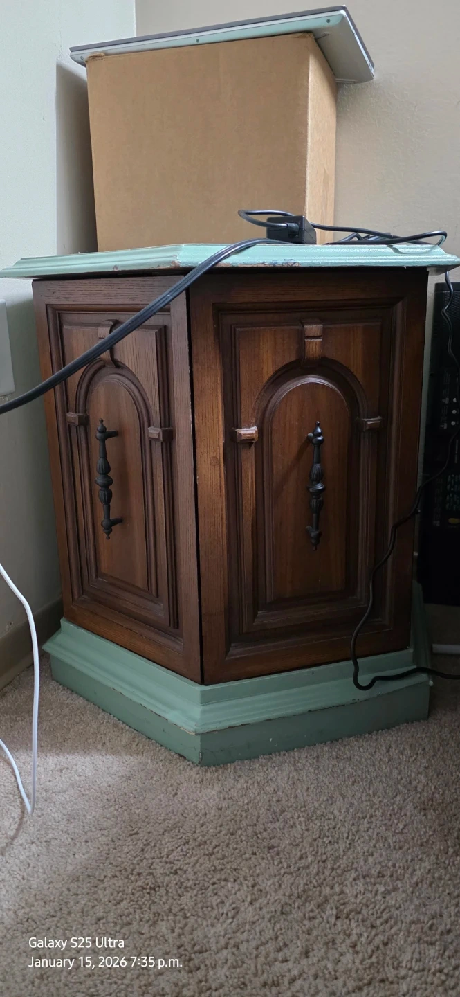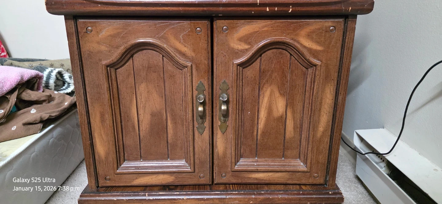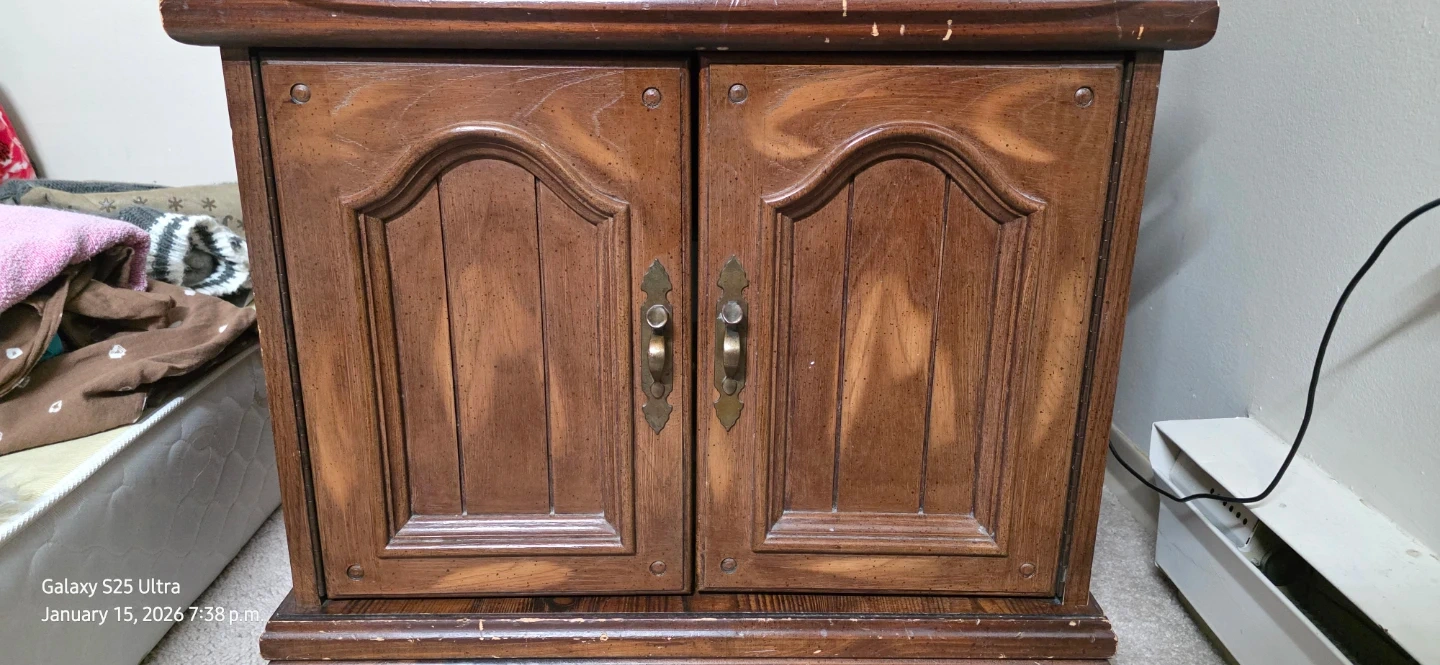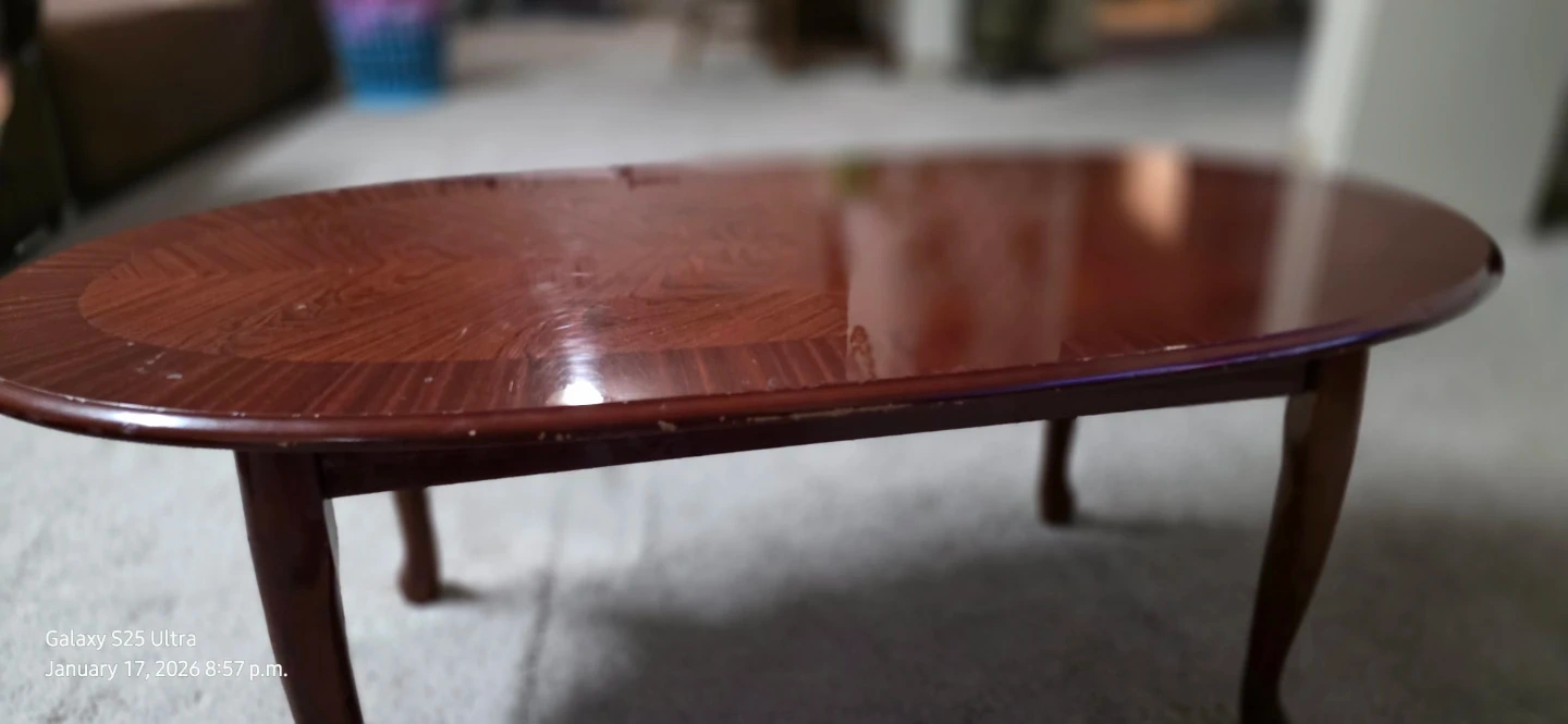 This oval coffee table is made of wood with a rich, dark stain and a patterned inlay on top. It has four sturdy legs and a classic design. This table offers a touch of vintage charm for your living room. It's suitable for most seating arrangements.