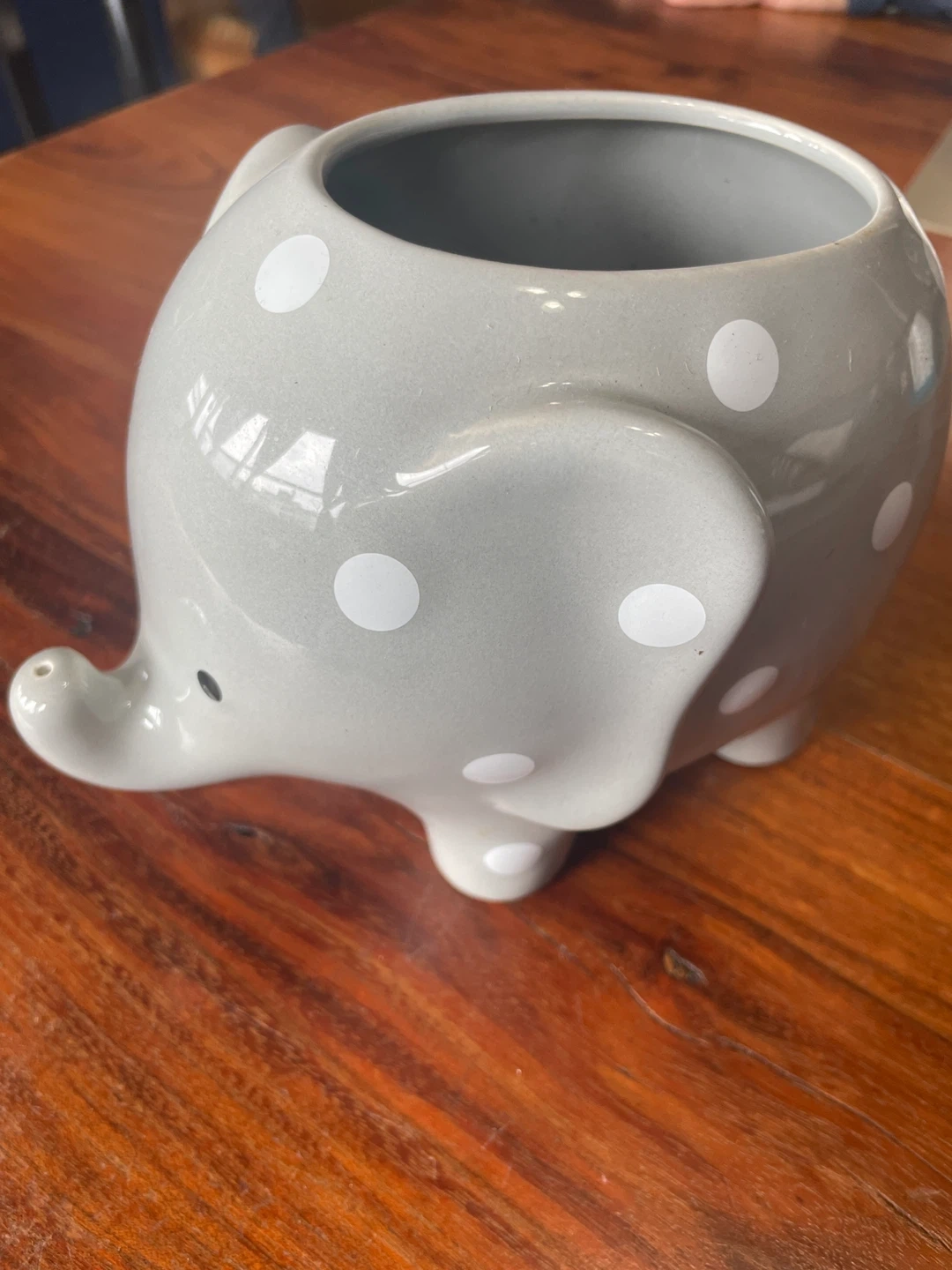Cute grey ceramic planter pot designed as an elephant with white polka dots.