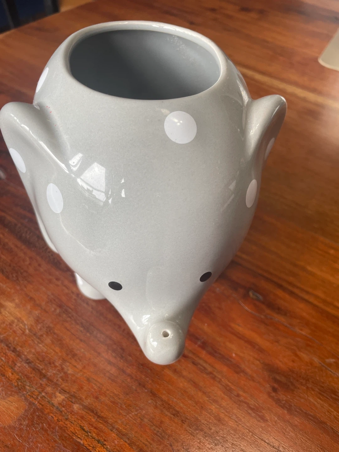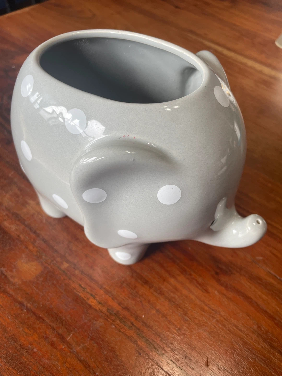 Cute grey ceramic planter pot designed as an elephant with white polka dots.