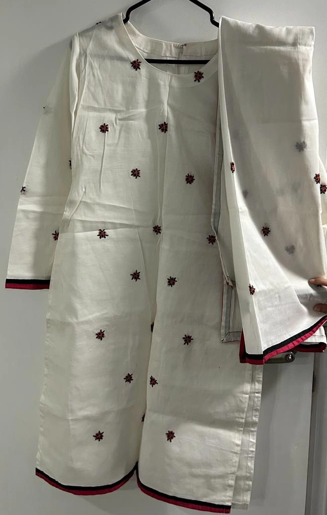 A beautiful white kurta and dupatta set with delicate floral embroidery. The kurta has a round neckline and three-quarter sleeves. The dupatta is plain with a black and pink border.