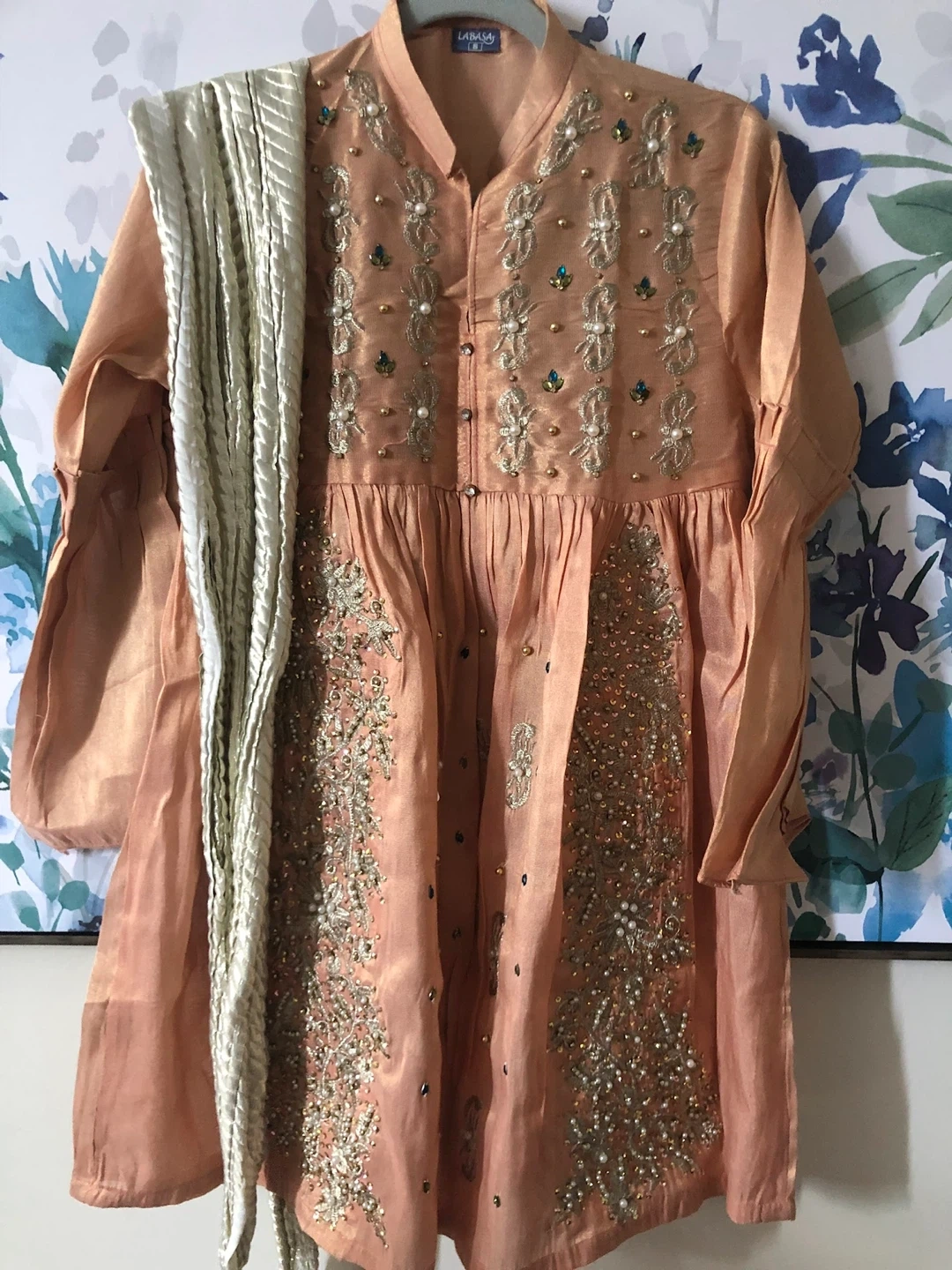 This is a lovely Labasa kurti with beautiful embroidery and a matching dupatta. The kurti features intricate detailing with pearls and embellishments. It's in great condition .