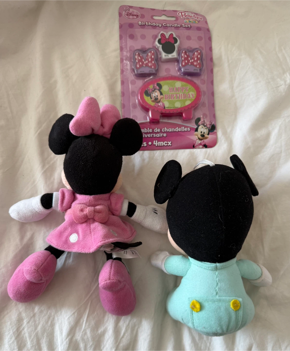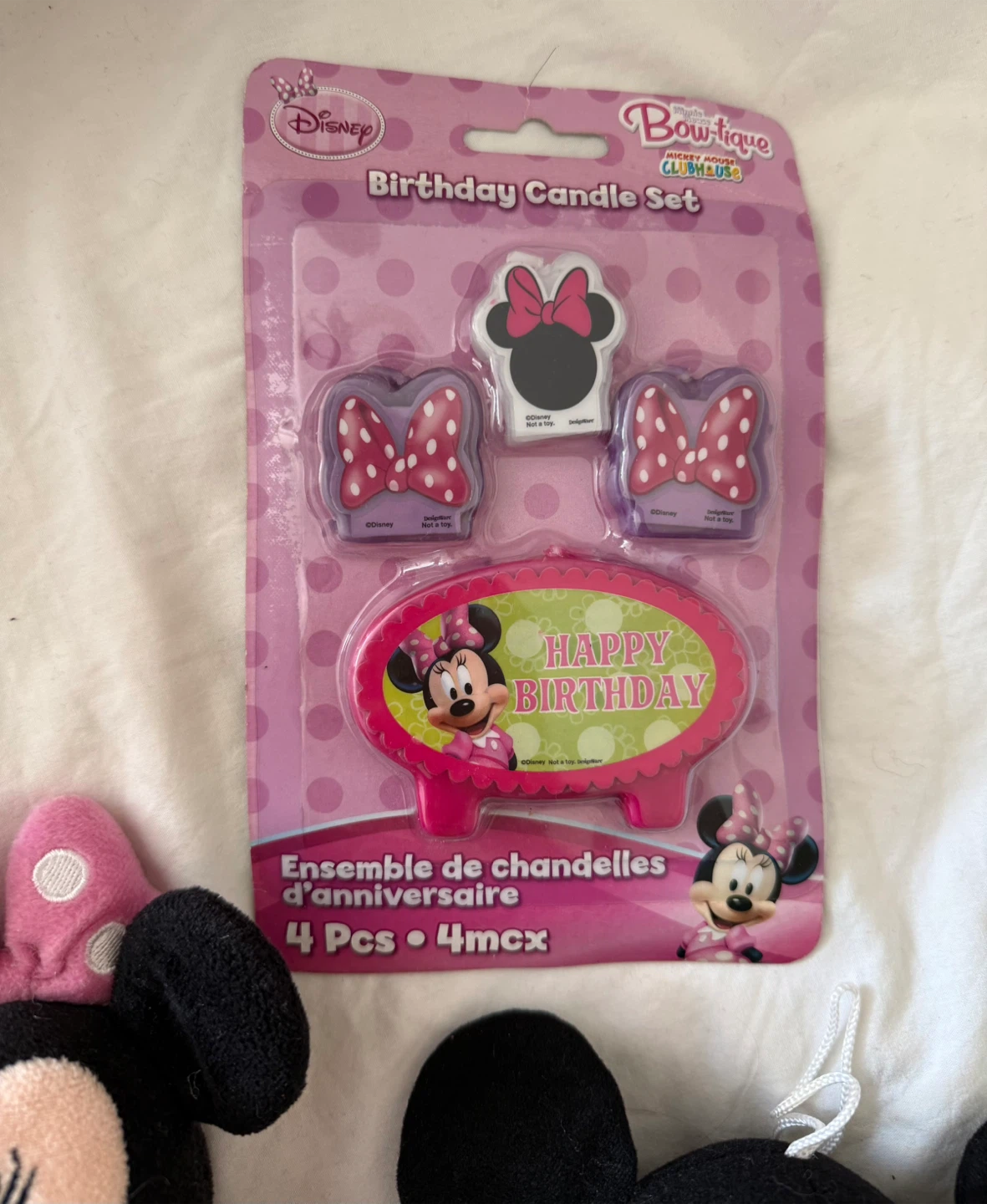 It also comes with a Bow-tique brand birthday candle set featuring Mickey and Minnie designs, totaling 4 pieces - brand new
