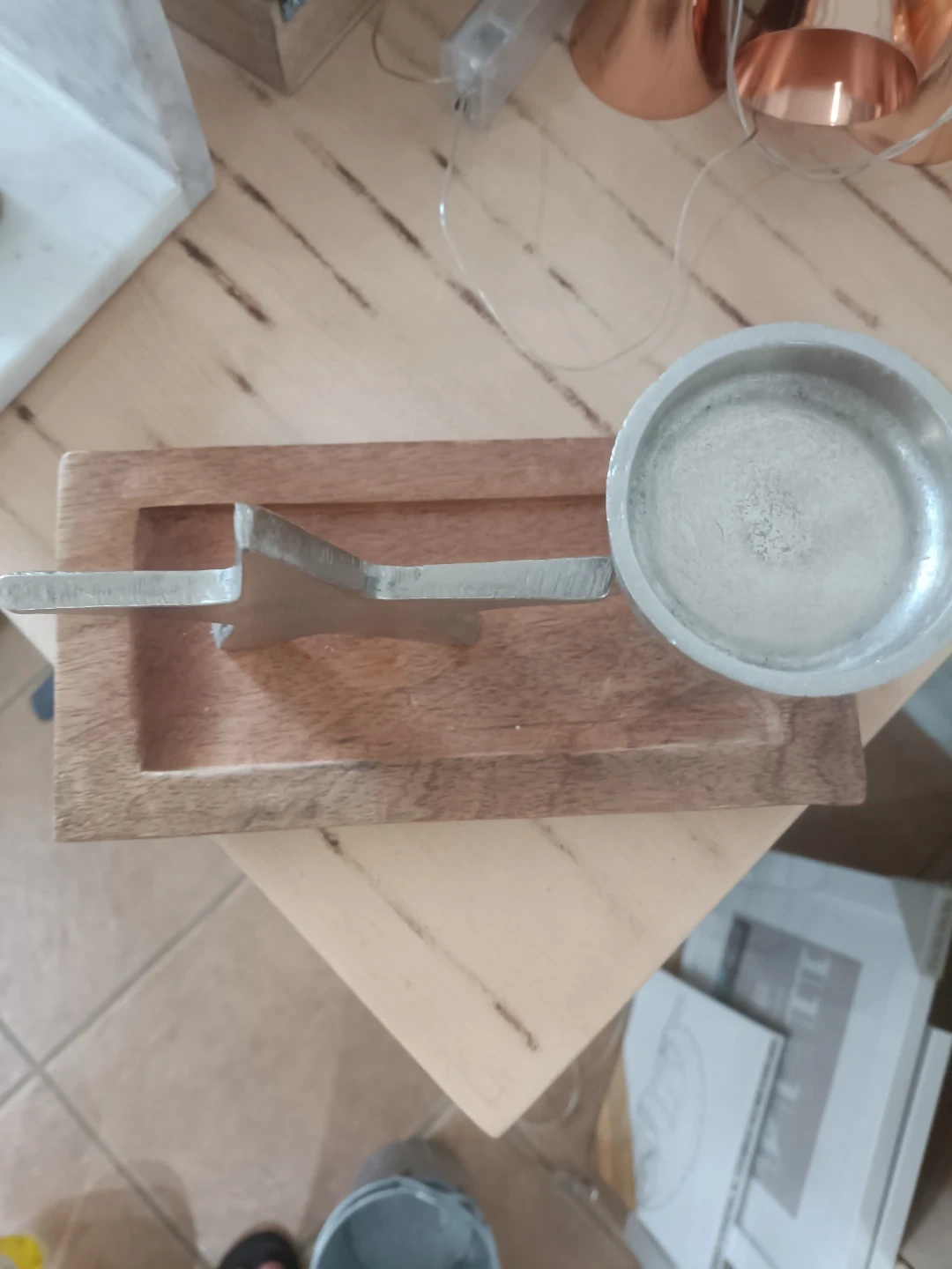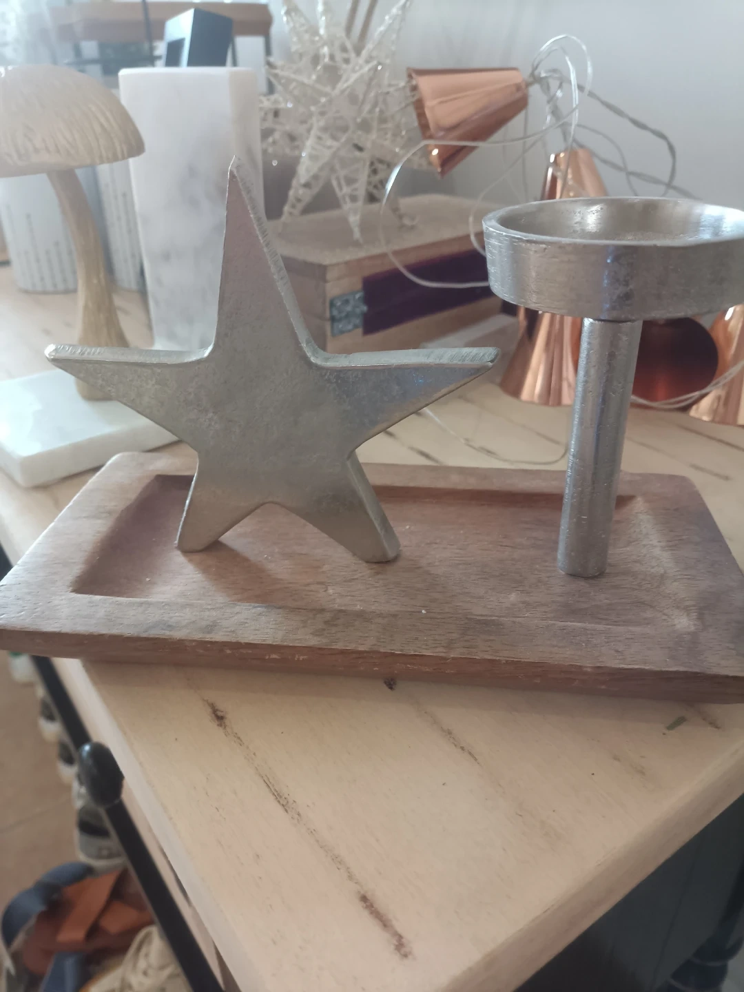Decorative metal tealight holder with a star accent. It sits on a rectangular wooden tray. This piece adds a charming touch to your coffee table or shelf.