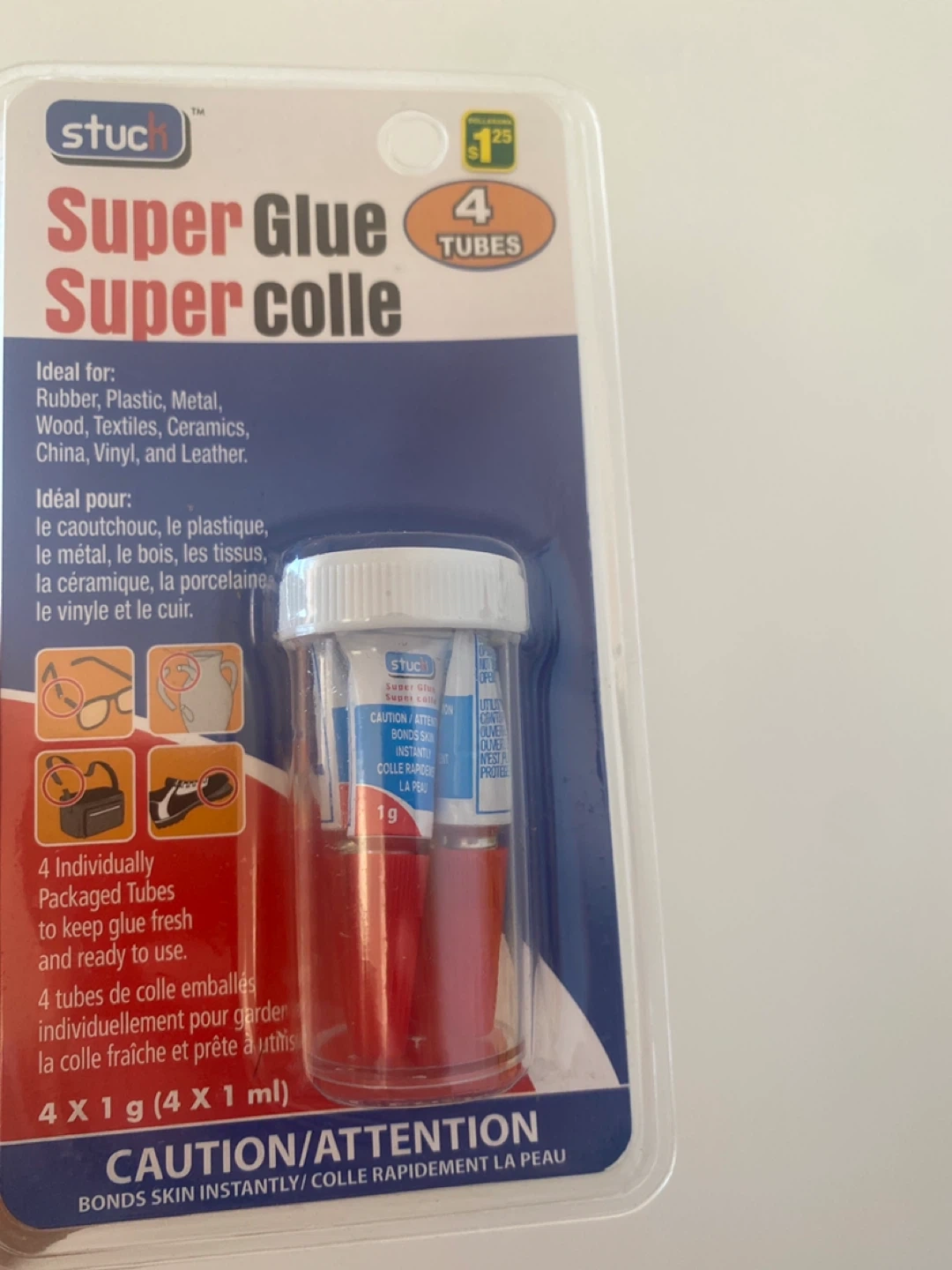 This is a 4-pack of STUC Super Glue, with each tube individually packaged to stay fresh. It's ideal for bonding rubber, plastic, metal, wood, textiles, ceramics, china, vinyl, and leather. Each tube contains 1g (1ml) of glue.