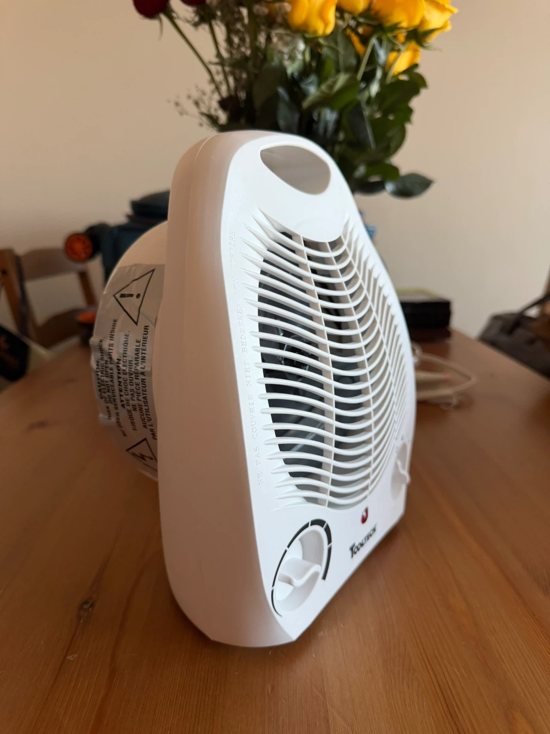 This is a ToolTech portable electric heater fan. It's white and has two control knobs for temperature and fan speed. A power indicator light is also present.