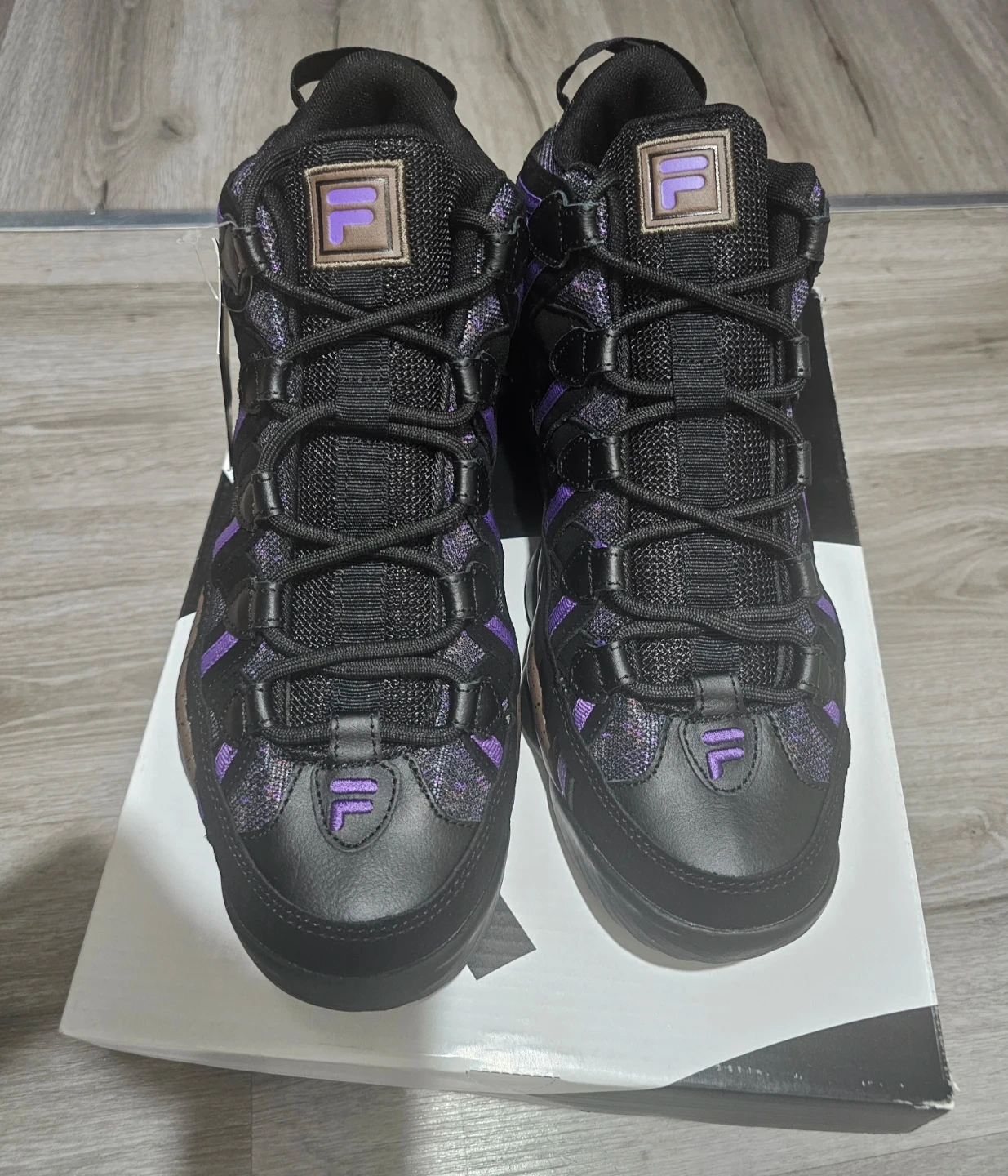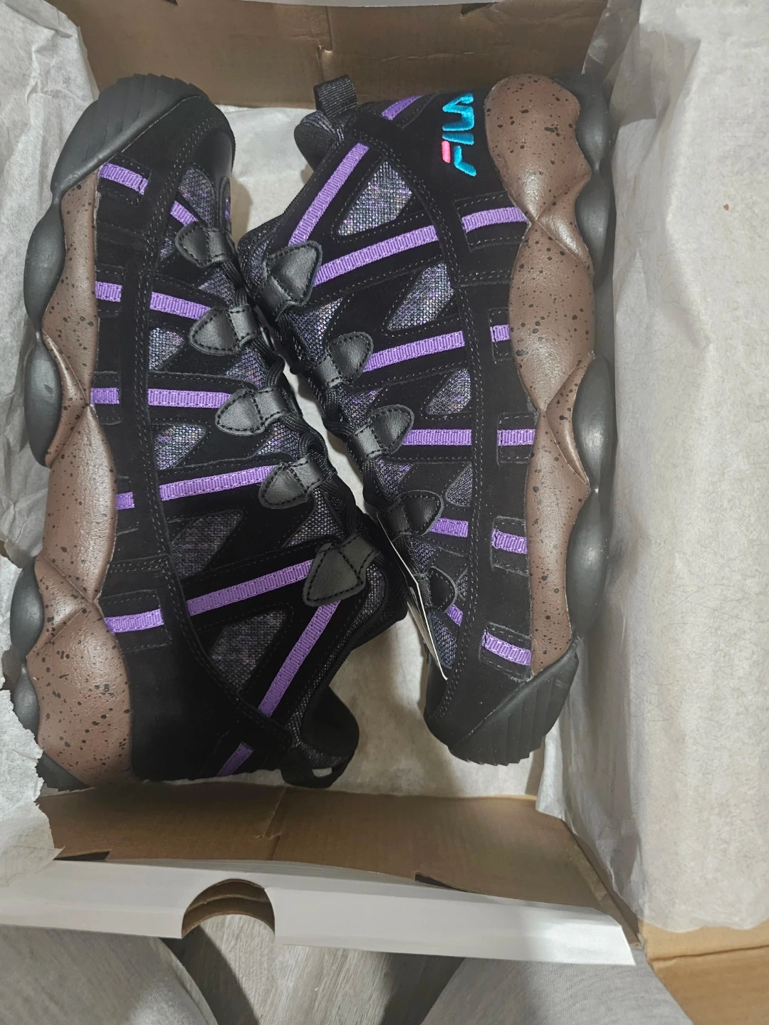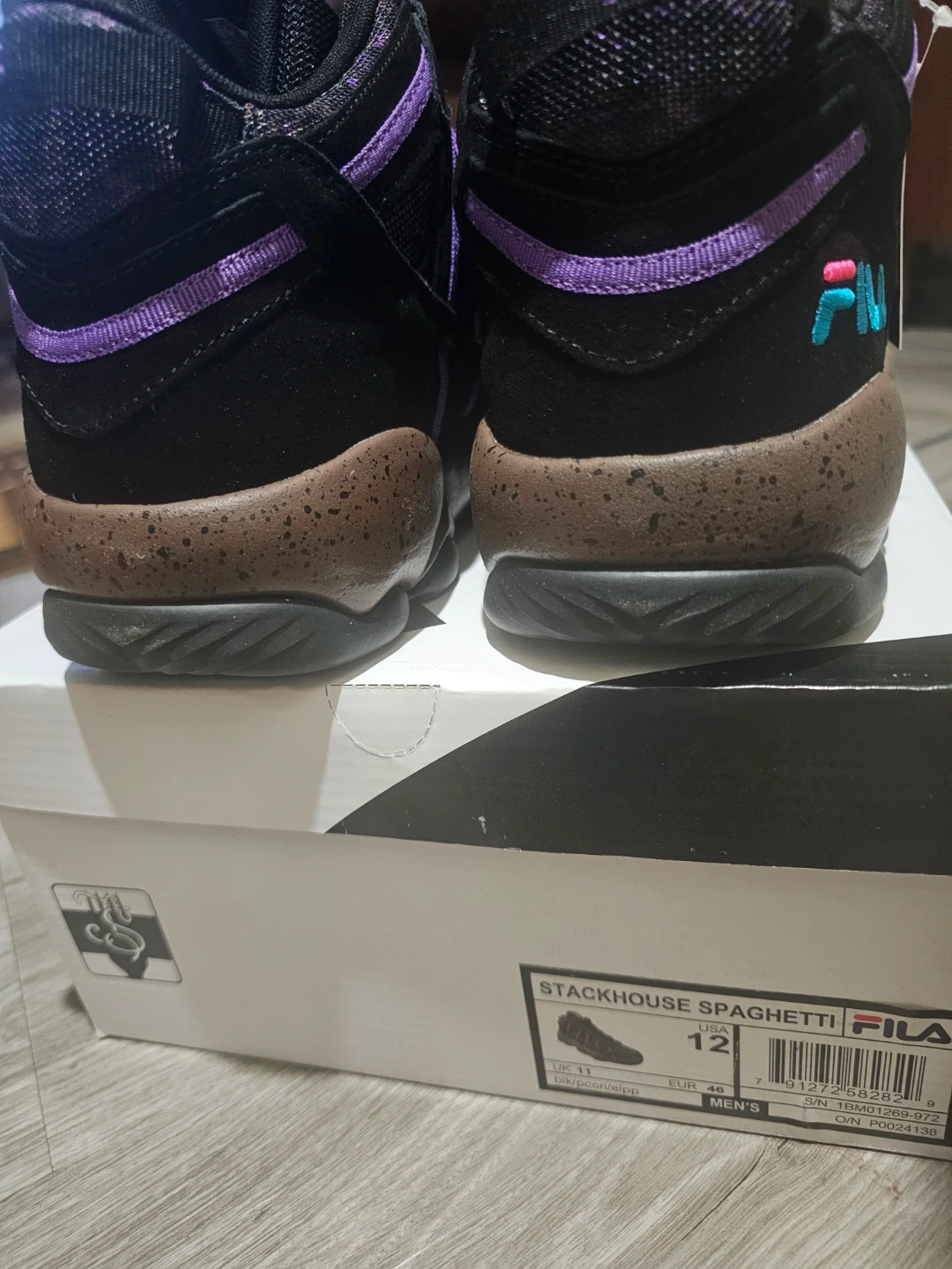 These Fila Stackhouse Spaghetti sneakers are black with purple accents. They come in a men's size 12. Includes original box.