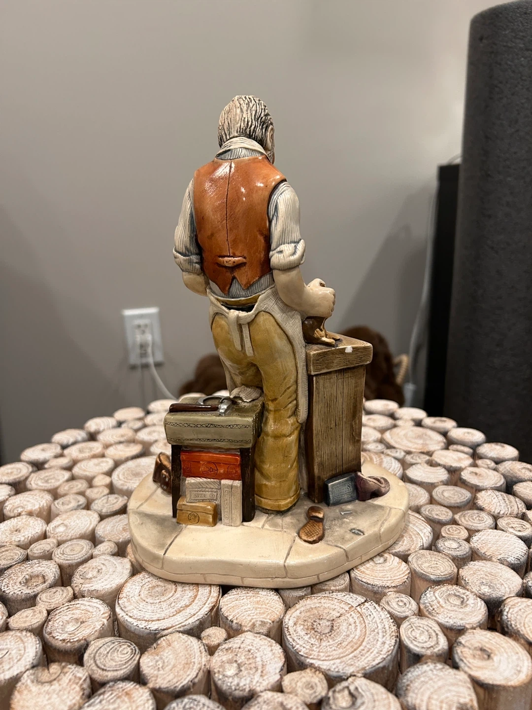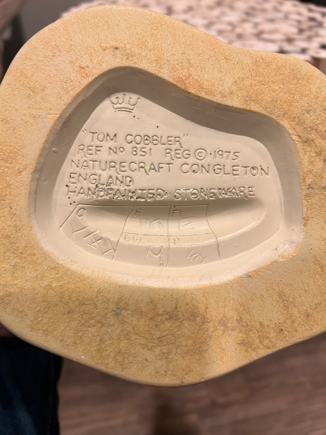 A handpainted stoneware figurine depicting 'Tom Cobbler'. This piece is dated 1975 and made in England. It's a detailed representation of a shoemaker at work.