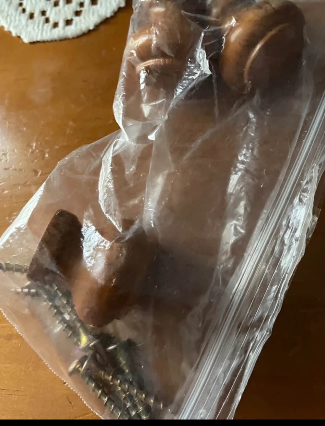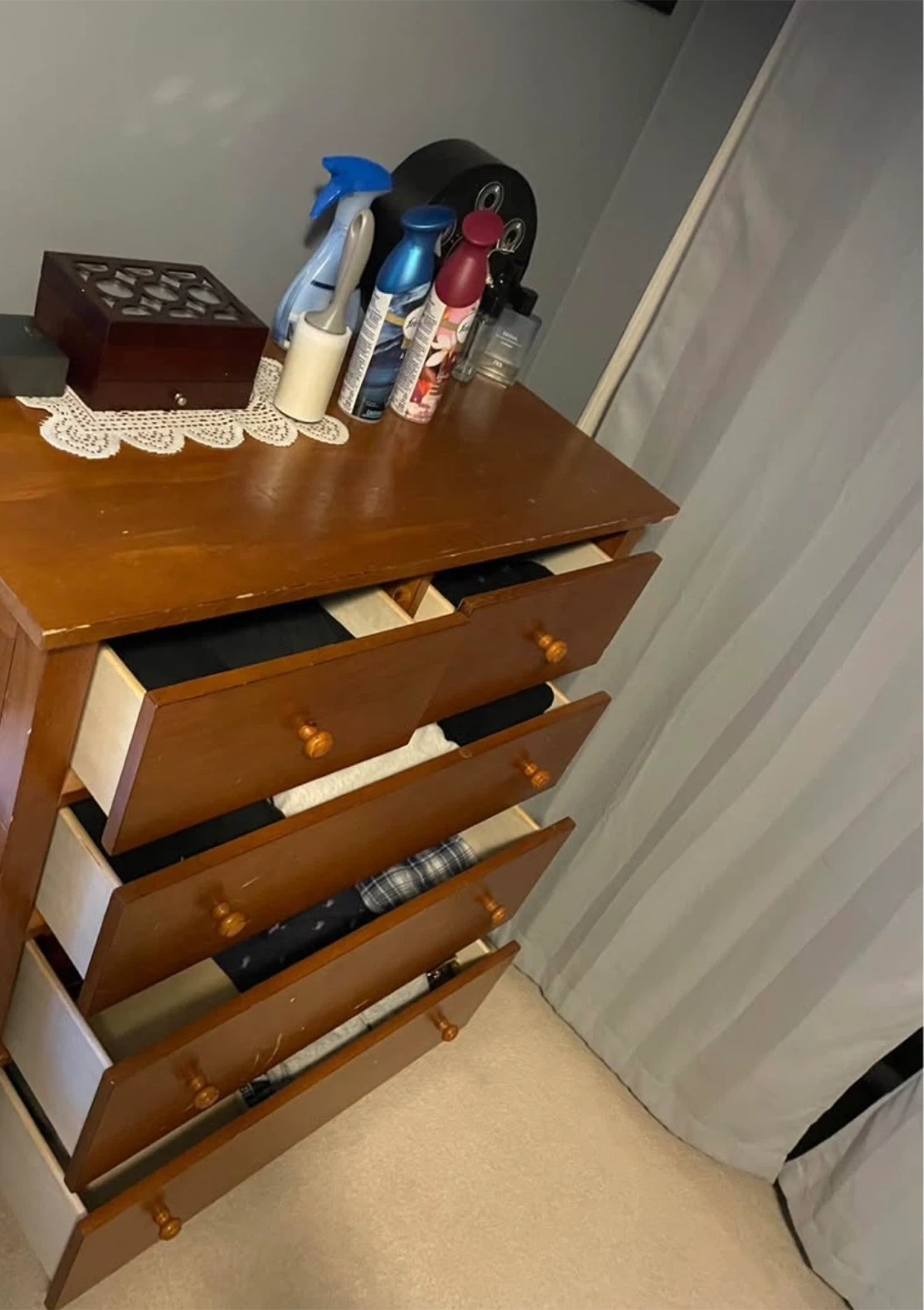 This is a wooden dresser with five drawers. It includes extra hardware and screws for assembly or repairs. Some of the drawers are opened to show contents.