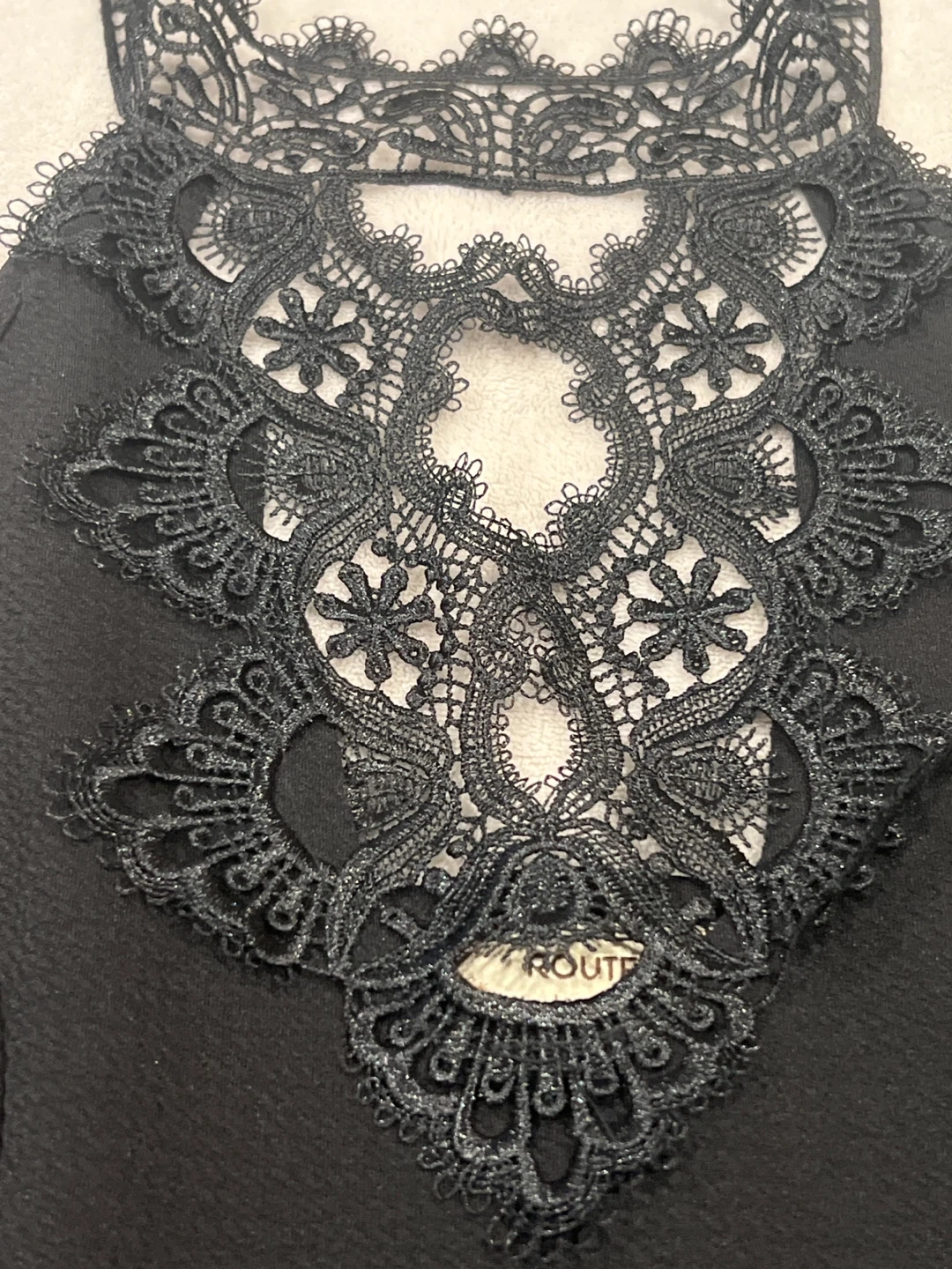 A black mini dress featuring intricate lace detailing at the neckline. Ribbon tie closure . It has a fitted silhouette and adjustable straps. This dress is perfect for a night out or a special occasion! BNWOT, super stretchy material means it can fit up to a medium. Pick up only near Runnymede stn. Message for additional photos